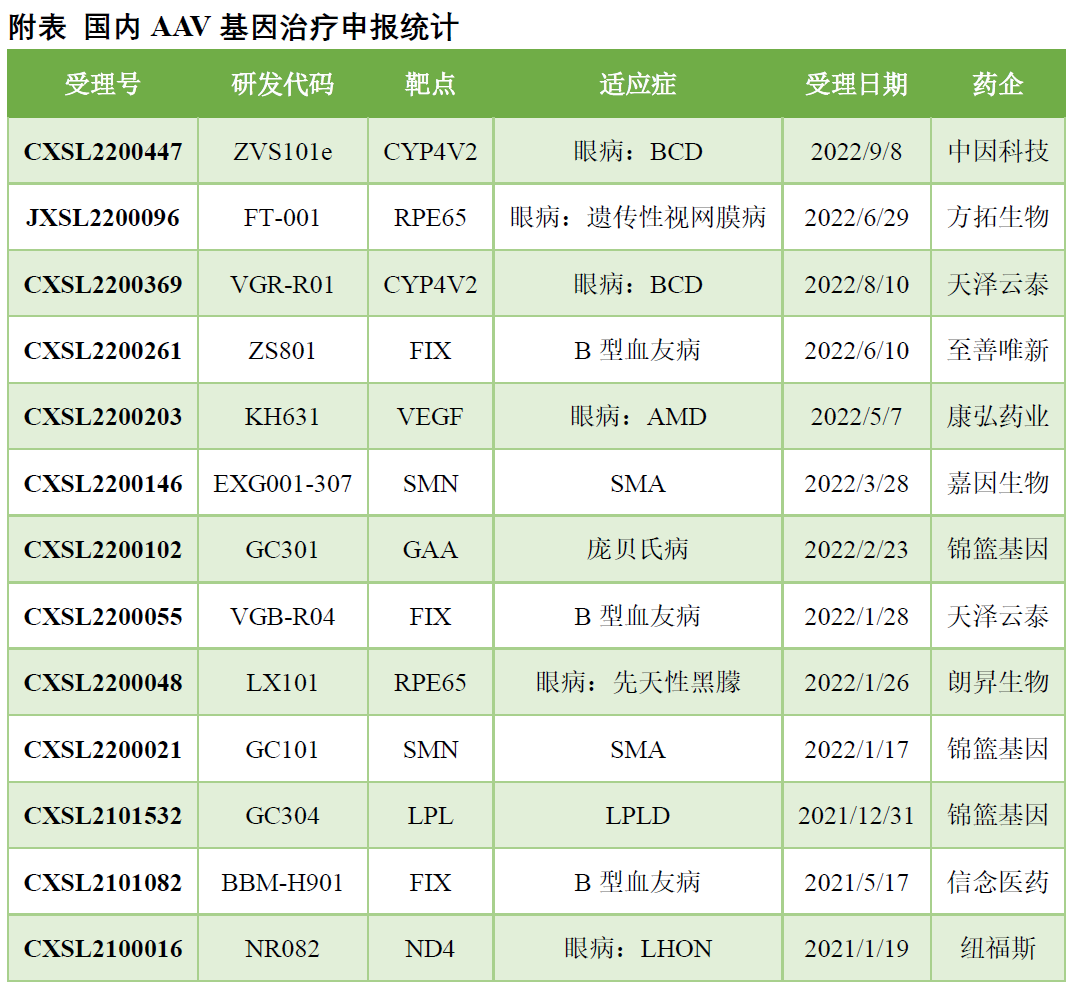 國內(nèi)方面,已經(jīng)累計(jì)申報(bào)13款A(yù)AV基因療法,其中2021年3款,2022年10款,呈快速增長的趨勢。