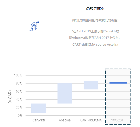 NXC-201是一款BCMACAR-T療法,該產品的CAR結構具有一定差異化設計,這種設計在試驗中顯示可降低免疫療法的毒性,讓患者可能在門診中使用。