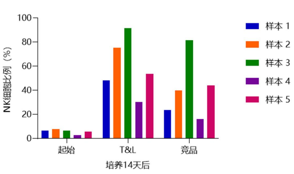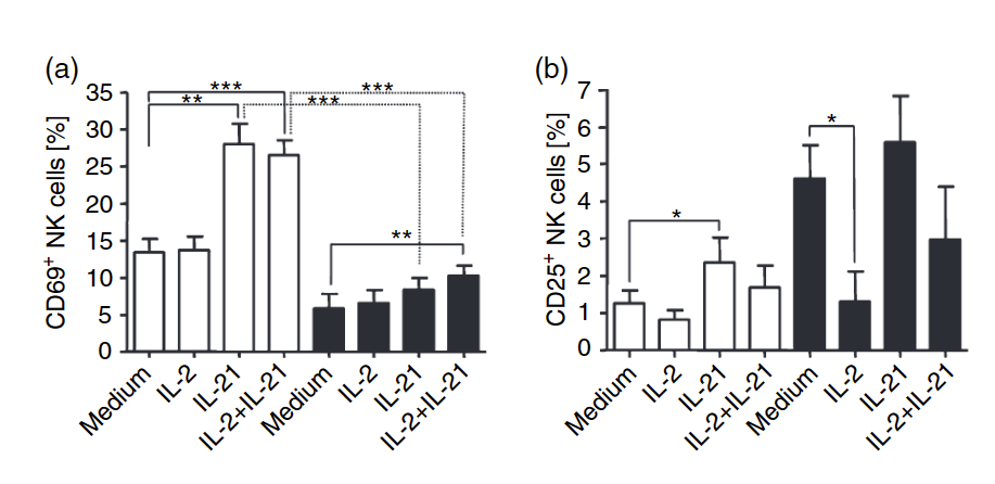 Wendt K等報道,在對NK細胞功能的調控中,單獨使用IL-2能促進人NK細胞的增殖,IL-2和IL-21聯合則產生更明顯的增殖效果。