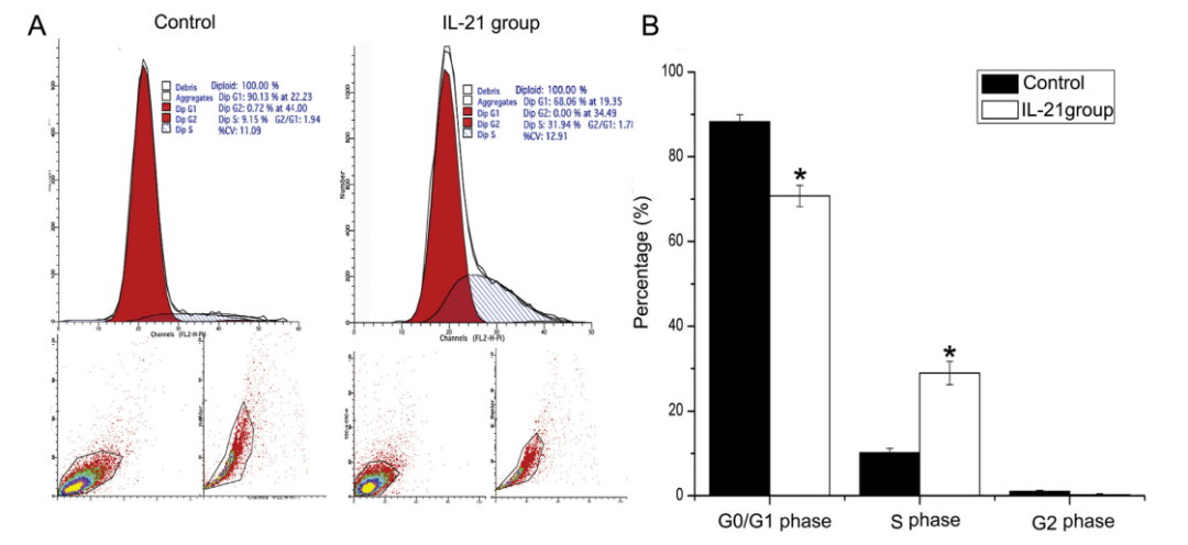 Li Q等報道IL-21對離體培養(yǎng)的人源NK細胞產生明顯的擴增效果,細胞數量呈濃度依賴性增加,在培養(yǎng)的第1~2周內也促進擴增細胞進入細胞周期S期。