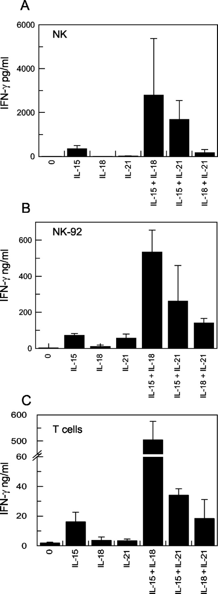 Strengell M, Matikainen S, Sirén J, Lehtonen A, Foster D, Julkunen I, Sareneva T. IL-21 in synergy with IL-15 or IL-18 enhances IFN-gamma production in human NK and T cells. J Immunol. 2003 Jun 1;170(11):5464-9. PMID: 12759422.