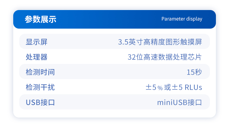 | 顯示屏:3.5英寸高精度圖形觸摸屏 | 處理器:32位高速數(shù)據(jù)處理芯片 | 檢測(cè)精度:********** | 大腸菌群:******** | 檢測(cè)范圍:*************** | 檢測(cè)時(shí)間:15秒 | 檢測(cè)干擾:±5﹪或±5 RLUs | 操作溫度范圍:5℃到40℃ | 操作濕度范圍:20—85﹪ | ATP回收率:90-110% | 檢出模式:RLU、大腸菌群篩查 | 50個(gè)用戶ID 設(shè)定 | 可設(shè)定的結(jié)果限值個(gè)數(shù):251個(gè) | 自動(dòng)判斷合格與不合格 | 自動(dòng)統(tǒng)計(jì)合格率 | 內(nèi)置自校光源 | 開機(jī)30秒自檢 | 配有miniUSB接口,可將結(jié)果上傳至PC | 配備專用軟件驅(qū)動(dòng)U盤代替?zhèn)鹘y(tǒng)光盤 | 儀器尺寸(W×H×D):188 mm×77mm×37mm | 使用可充電鋰電池免電池更換 | 備用狀態(tài)(20℃):6個(gè)月 | 中文操作手冊(cè) | 穩(wěn)定的液體熒光素酶 | 潤(rùn)濕的一體化采集拭子 |