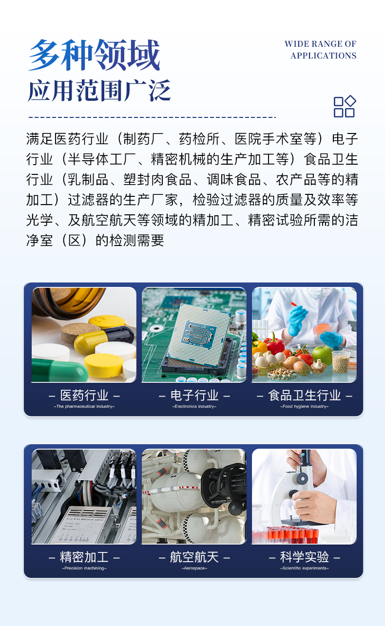 滿足醫(yī)藥行業(yè)(制藥廠、藥檢所、醫(yī)院手術室等);電子行業(yè)(半導體工廠、精密機械的生產加工等);食品衛(wèi)生行業(yè)(乳制品、塑封肉食品、調味食品、農產品等的精加工);過濾器的生產廠家,檢驗過濾器的質量及效率等;光學、及航空航天等領域的精加工、精密試驗所需的潔凈室(區(qū))的檢測需要。