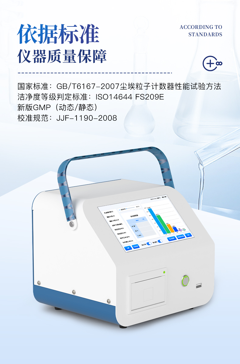 國家標準:GB/T6167-2007塵埃粒子計數器性能試驗方法 潔凈度等級判定標準:ISO14644 FS209E ,新版GMP(動態(tài)/靜態(tài)) 校準規(guī)范:JJF-1190-2008