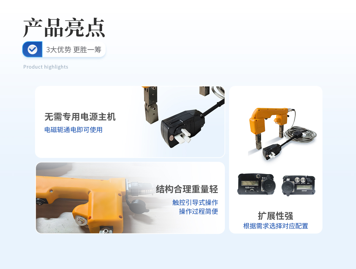 | 1、 無需專用電源主機(jī),電磁軛通電即可使用; | 2、 體積小巧,重量輕; | 3、 開模制作,結(jié)構(gòu)合理,手感舒適; | 4、 磁軛標(biāo)配白光燈,可選熒光燈(不額外加費(fèi)用); | 5、 配專用儀器箱; | 6、 擴(kuò)展性強(qiáng),可根據(jù)需要增配對應(yīng)的專用電池包,通過專用電源來實(shí)現(xiàn)交流、直流磁化功能??蓾M足不方便拖電源線的場所使用。 |