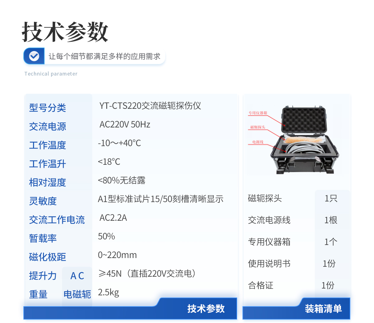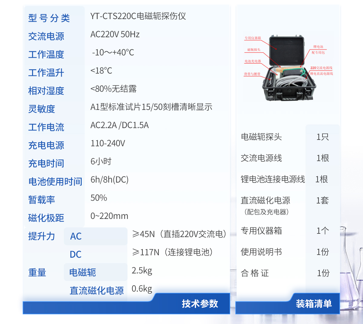 | 1.磁軛探頭1只 | 2.交流電源線1根 | 3.鋰電池連接電源線 1 根 | 4.直流磁化電源(配包及充電器) 1 套 | 5.專用儀器箱 1 個(gè) | 6.使用說明書 1 份 | 7.合 格 證 1 份 |