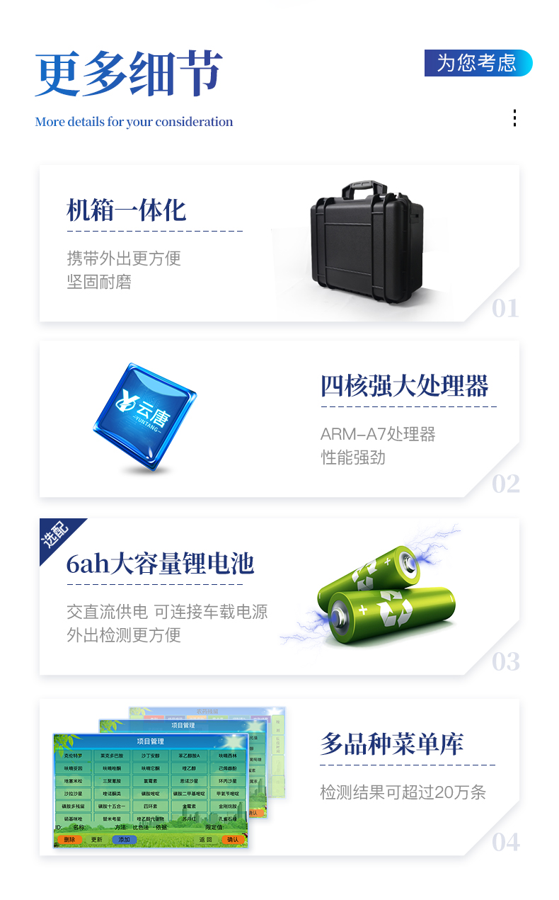 產品介紹: 「山東云唐」是多年茶葉農藥殘留檢測儀生產廠家,設備方便攜帶,穩(wěn)固耐用,檢測速度快,歡迎新老客戶來電咨詢。2026-02-23
