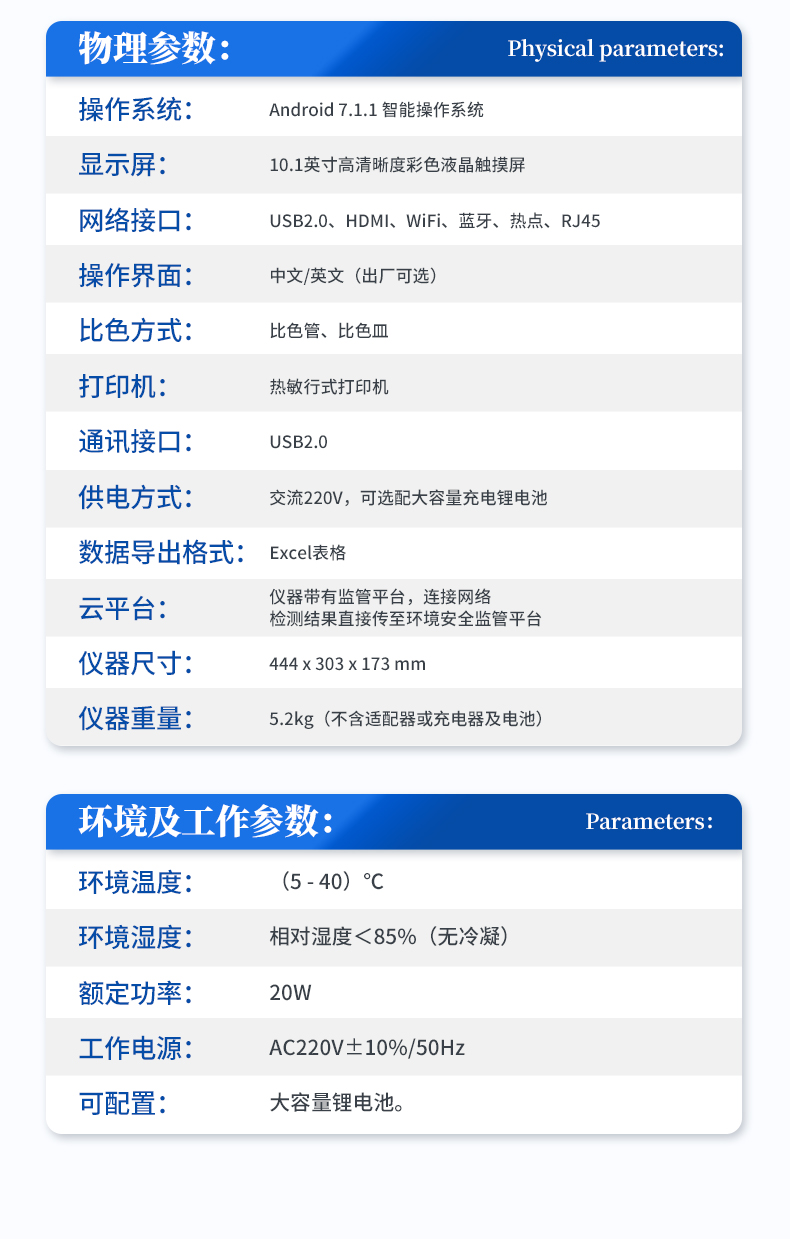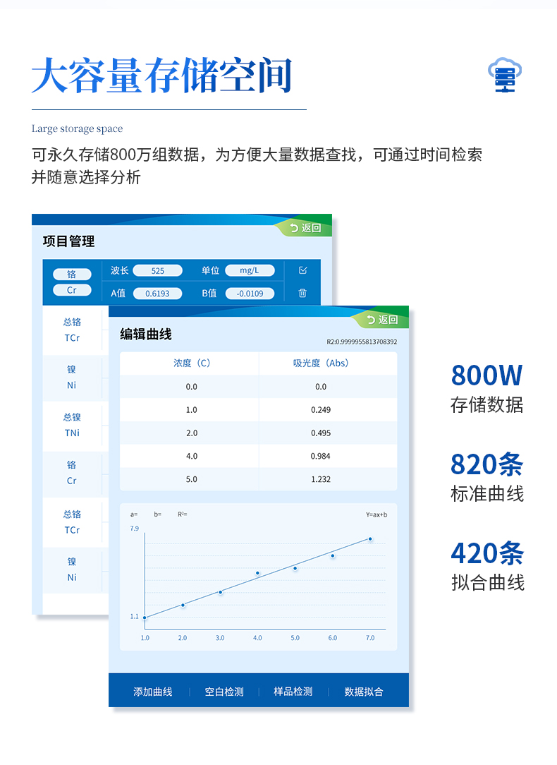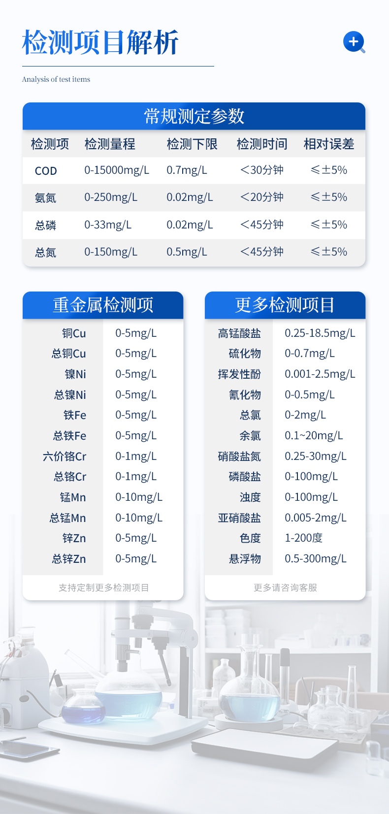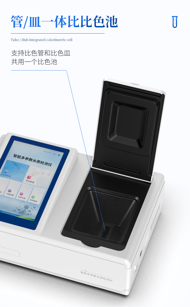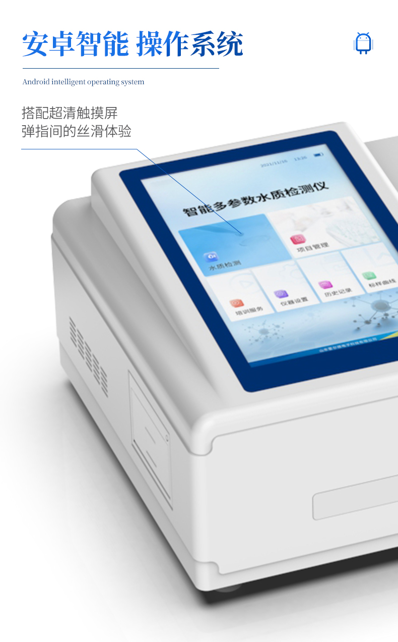主要檢測(cè)COD、氨氮、總磷、總氮、磷酸根、硝酸鹽氮、總銅、銅、鉻、總鉻、鋅、總鋅、亞鐵、鎳、總鎳、錳、總錳、二氧化硅、總氯、余氯、鎘、鉛、鈦、釩、銀、鋁、硼、砷、錫、鈹、鋇、銻、汞、鈷、高錳酸鹽、硫酸鹽、氟化物、硫化物、氰化物、總氰化物、揮發(fā)性酚、苯胺、甲醛、甲醇、吊白塊、二氧化硫、雙氧水、濁度、色度、懸浮物、溶解氧、尿素、氰尿酸、亞硝酸鹽、臭氧、pH、二氧化氯等指標(biāo),兼具智能數(shù)據(jù)分析功能,圖表、列表顯示數(shù)據(jù),分析一目了然;高清晰度彩色液晶觸摸顯示屏,Android智能操作系統(tǒng),中文顯示界面,中英文鍵盤,人性化操作,使用更簡(jiǎn)單。