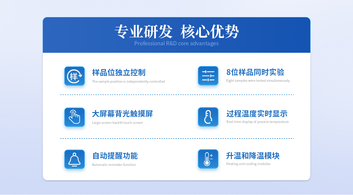 | ◆ 全樣品位:8位, | ◆ 樣品位可獨(dú)立控制:每個(gè)樣品位獨(dú)立控制,*多實(shí)現(xiàn)8位樣品同時(shí)實(shí)驗(yàn)。 | ◆ 恒溫控制功能:**的升溫和降溫模塊,自動控制實(shí)驗(yàn)操作在恒溫25℃下進(jìn)行,實(shí)驗(yàn)過程溫度實(shí)時(shí)顯示。 | ◆ 測量提醒功能:到達(dá)檢測條件后自動提醒功能,保證每次實(shí)驗(yàn)的及時(shí)進(jìn)行。 | ◆ 控溫精度:25℃±1℃ | ◆ 大屏幕背光觸摸屏,方便直觀操作。 |