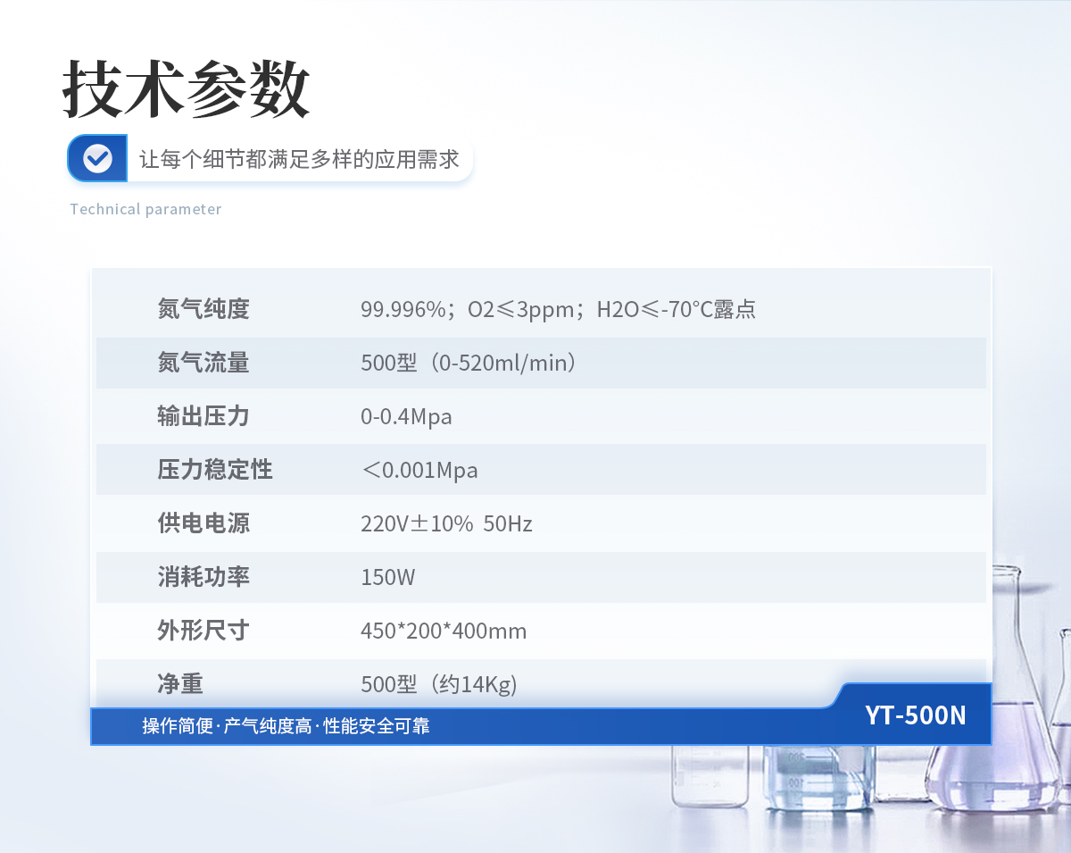 產(chǎn)品介紹: 儀器特點:1. 氮氣純度:含氧量<3PPM,含水量露點-56℃ 2. 氮氣流量:0-300ml/min 3. 輸出壓力:0-0.4Mpa(由原料空氣壓力決定) 4. 壓力穩(wěn)定性:< 0.003MPa(視空氣源的穩(wěn)定性) 5. 供電···2026-02-23