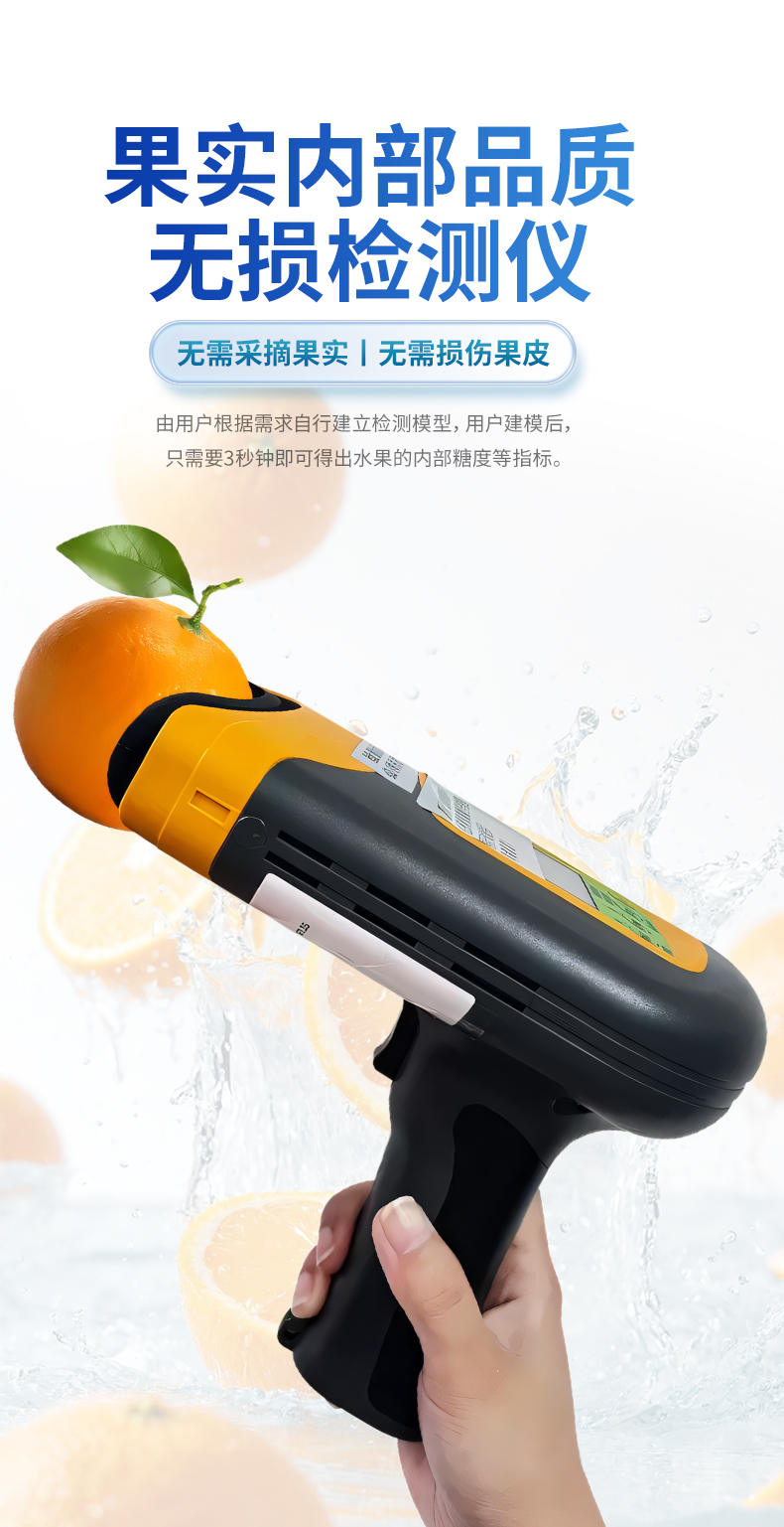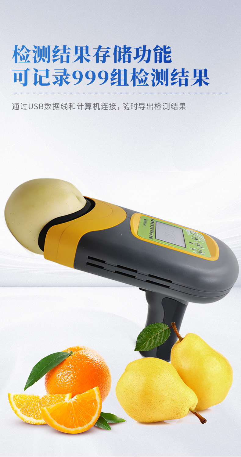 果實內(nèi)部品質(zhì)無損檢測儀是一款便攜式的果實質(zhì)量檢測儀,可以方便的檢測水果內(nèi)部的糖度、干物質(zhì)等指標(biāo),由用戶根據(jù)需求自行建立檢測模型,用戶建模后,只需要3秒鐘即可得出水果的內(nèi)部糖度等指標(biāo)。儀器內(nèi)置可充電鋰電池,單次充滿后可連續(xù)檢測2000次,檢測結(jié)果實時顯示在設(shè)備屏幕上,用戶可以通過數(shù)據(jù)線將檢測數(shù)據(jù)上傳到電腦中。