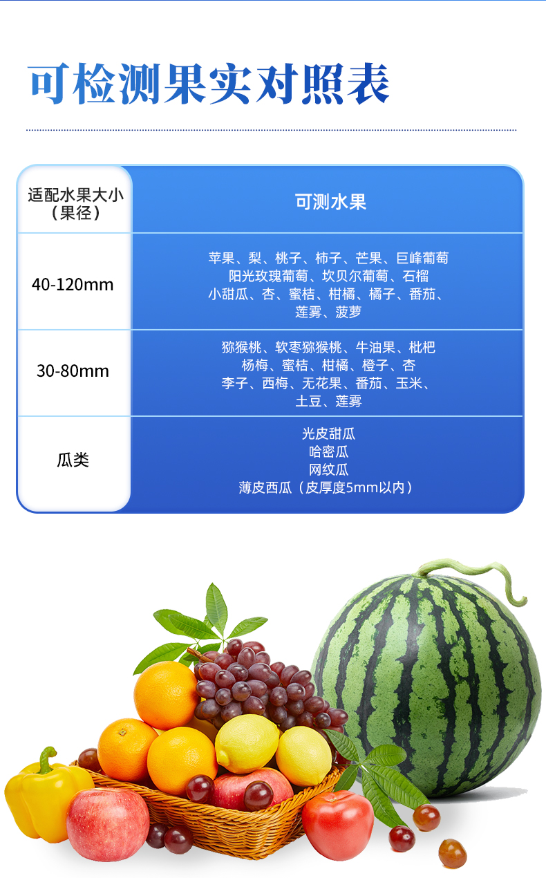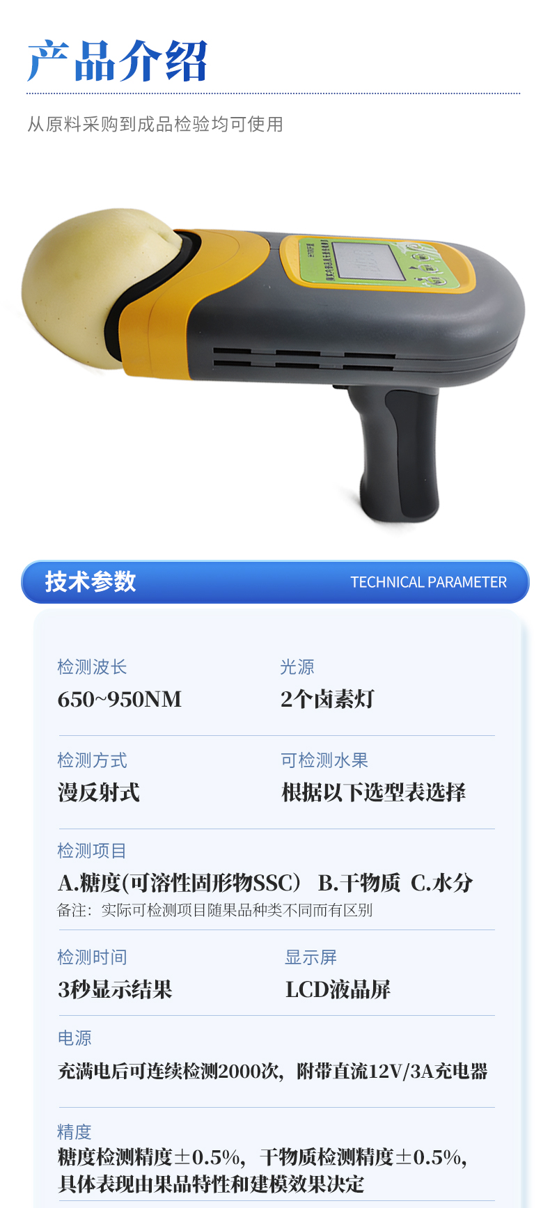| 1.檢測波長:650~950nm; | 2.光源:2個鹵素?zé)簦?/td> | 3.檢測方式:漫反射式; | 4.可檢測水果:根據(jù)以下選型表選擇 | 5.適配水果大?。ü麖剑篐100F型(40-120mm),H100C型(30-80mm),H100M型(瓜類) | 6.檢測項目: a.糖度(可溶性固形物SSC) b.干物質(zhì) c.水分 備注:實際可檢測項目隨果品種類不同而有區(qū)別 | 7.檢測時間:3秒顯示結(jié)果; | 8.電源:充滿電后可連續(xù)檢測2000次,附帶直流12V/3A充電器; | 9.精度:糖度檢測精度±0.5%,干物質(zhì)檢測精度±0.5%,具體表現(xiàn)由果品特性和建模效果決定; | 10.檢測結(jié)果校正:帶有檢測值補(bǔ)償功能,可直接在儀器或軟件上腦操作調(diào)整;同時支持模型修正,可在配套設(shè)置軟件上直接操作; | 11.模型存儲:儀器可同時存儲多套檢測模型,檢測模型的名稱與存儲順序可由用戶通過配套軟件為儀器設(shè)定; | 12.數(shù)據(jù)傳輸:支持USB數(shù)據(jù)線傳輸,內(nèi)置藍(lán)牙模塊支持無線傳輸; | 13.手機(jī)/移動終端傳輸功能:可將儀器檢測的結(jié)果實時傳輸?shù)脚涮椎氖謾C(jī)APP并進(jìn)行存儲,可在手機(jī)上導(dǎo)出存儲的所有檢測結(jié)果,儀器配套的手機(jī)APP為免費(fèi)使用; | 14.提供傳輸協(xié)議,可供用戶進(jìn)行二次開發(fā),實現(xiàn)實時檢測、實施遠(yuǎn)程傳輸數(shù)據(jù)的功能; | 15.標(biāo)簽自動識別功能:內(nèi)置RFID模塊,可自動識別帶有果樹編號的標(biāo)簽卡; | 16.支持光譜信息存儲和導(dǎo)出; | 17.配套建模軟件:配備免費(fèi)建模軟件,可由用戶自行建立檢測模型,也可由用戶導(dǎo)出原始光譜文件后自行建模;儀器也可導(dǎo)出光譜源文件,由用戶自主使用其他軟件建模; | 18.檢測結(jié)果存儲功能:儀器內(nèi)部可記錄999組檢測結(jié)果,并可通過USB數(shù)據(jù)線和計算機(jī)連接,隨時導(dǎo)出檢測結(jié)果; | 19.操作環(huán)境:5~30℃,85%RH環(huán)境內(nèi)使用 | 20.顯示屏:LCD液晶屏 | 21.電池信息:2000mA可充電鋰電池 | 22.尺寸:110×160×169mm,400g,ABS材質(zhì) | 23.附件:橡膠遮光罩,充電器,USB數(shù)據(jù)線,便攜箱,軟件(免費(fèi)電子版) |