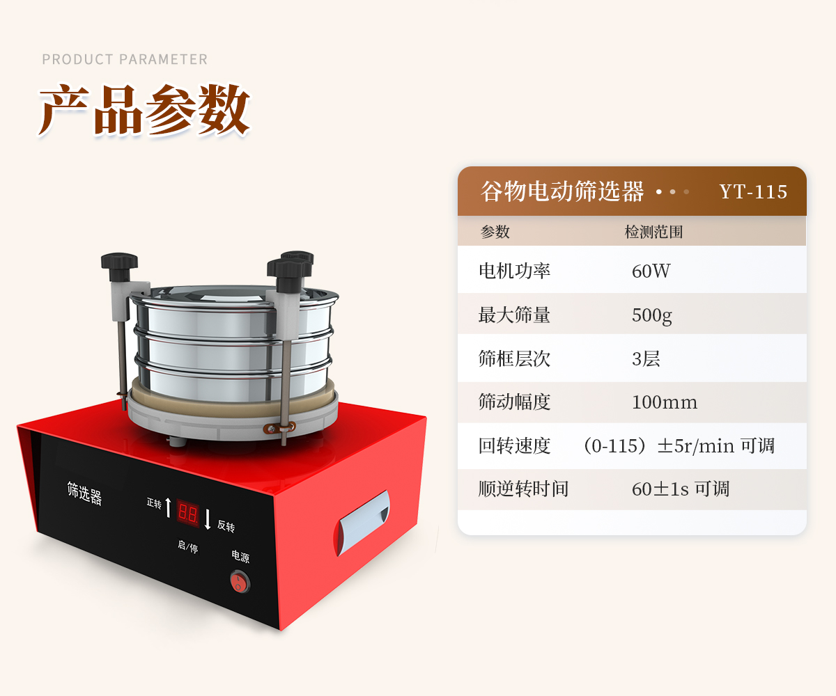 產(chǎn)品介紹: 電動(dòng)篩選器 YT-115 用途主要用于谷物選篩電動(dòng)篩選器YT-115技術(shù)參數(shù)1、電機(jī)功率:60W;2、**篩量:500g;3、篩框?qū)哟危?層;4、篩動(dòng)幅度:100mm;5、回轉(zhuǎn)速度:(0-115)±5r/min 可調(diào);6、順逆···2026-02-23