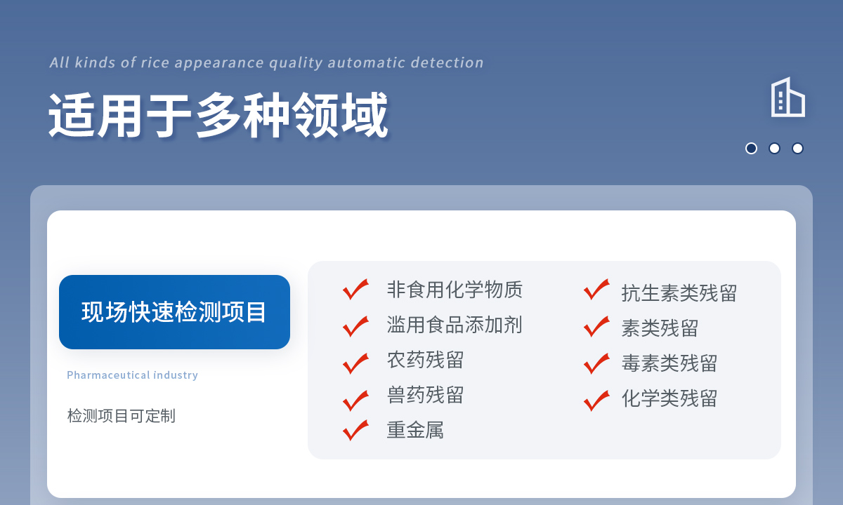 5、一體化便攜式快檢設(shè)備,滿足現(xiàn)場(chǎng)及流動(dòng)檢測(cè)使用需求,能夠在同一軟件下實(shí)現(xiàn)所有檢測(cè)項(xiàng)目的檢測(cè),并可通過同一窗口直觀顯示檢測(cè)結(jié)果。