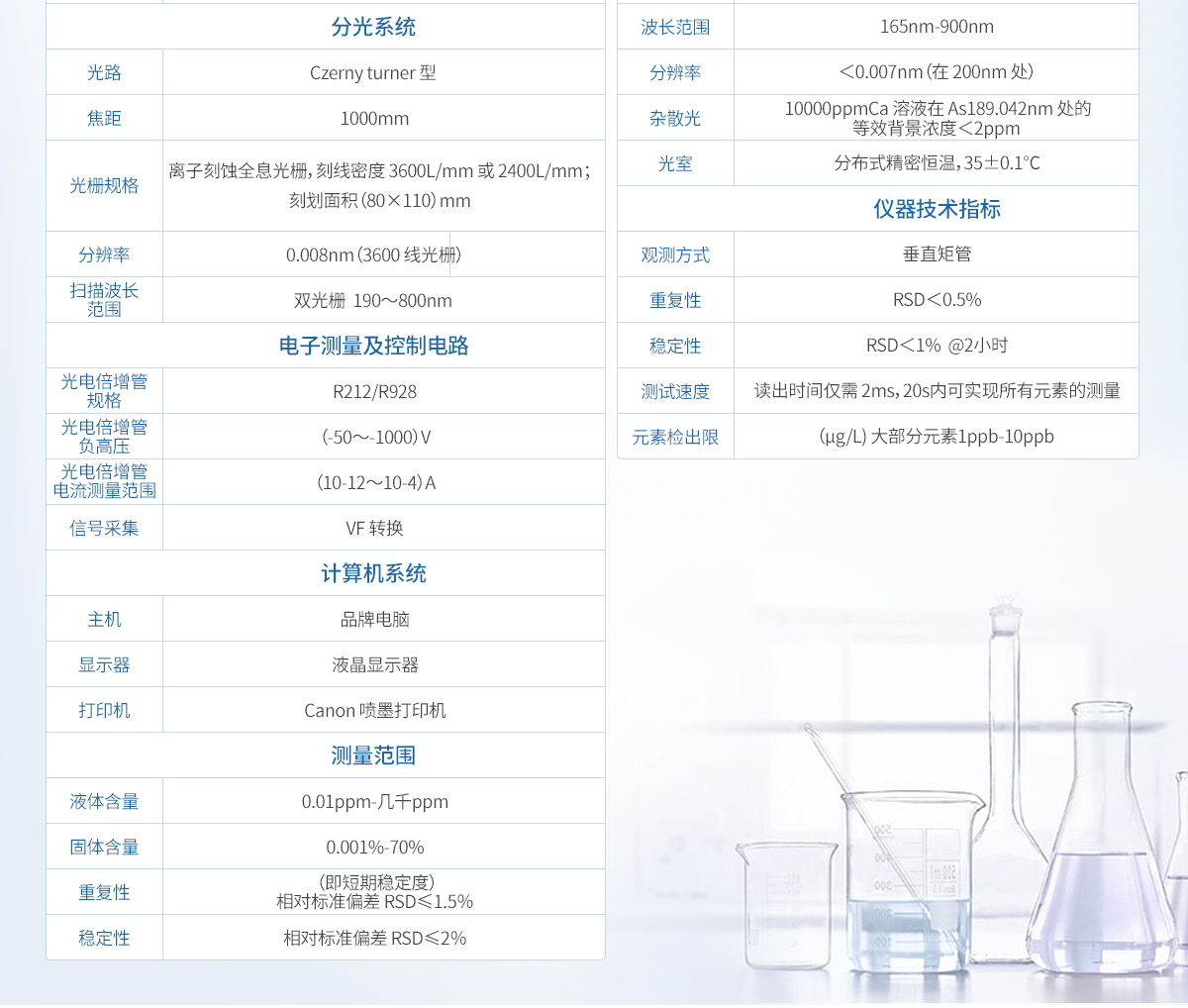 3、光學(xué)系統(tǒng) 3.1 新一代中階梯光柵及棱鏡作為分光元件,內(nèi)部無活動部件,光學(xué)穩(wěn)定性好。 3.2 恒溫光學(xué)系統(tǒng),所有光學(xué)元件均密封于恒溫光室中,主機與光室隔離式設(shè)計。光室內(nèi)部 精密恒溫 36℃±0.1℃,氬氣吹掃。 3.3 光路焦距:440mm,全反射成像光路,石英棱鏡二維色散系統(tǒng)。 3.4 光學(xué)系統(tǒng)波長范圍:165-900nm,全波長覆蓋。 3.5 波長校正: 每次點火,軟件自動采用 C、N、Ar 等空氣元素譜線進行譜峰位置校正,保 證分析波長的正確性,無須波長校正溶液。 3.6 吹掃型光室:對 189nm 以下波長測定,可選擇氬氣或氮氣進行光路吹掃。 3.7 雜散光:≤2.0mg/L(10000mg/L Ca 溶液在 As 188.980nm 處測定)。 3.8 光學(xué)分辨率:≤0.007nm(在 200nm 處)。