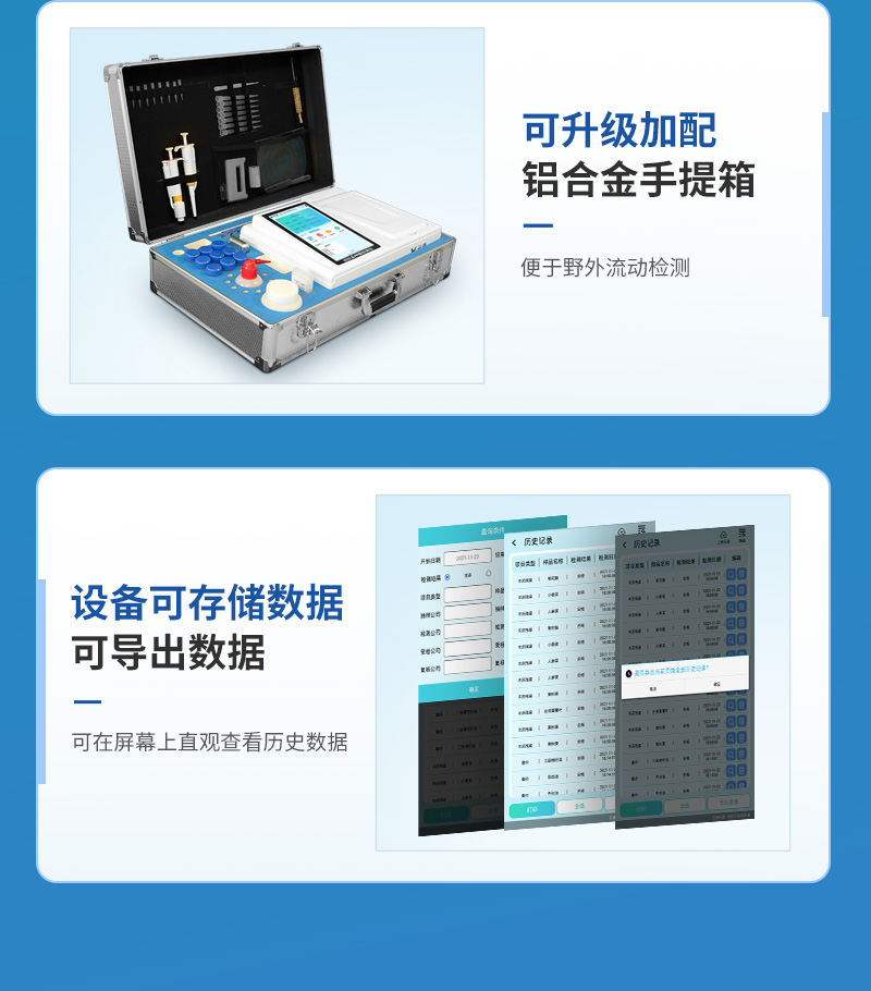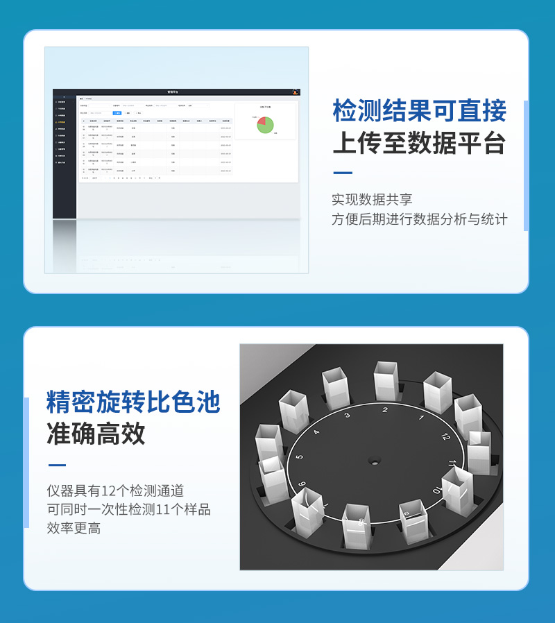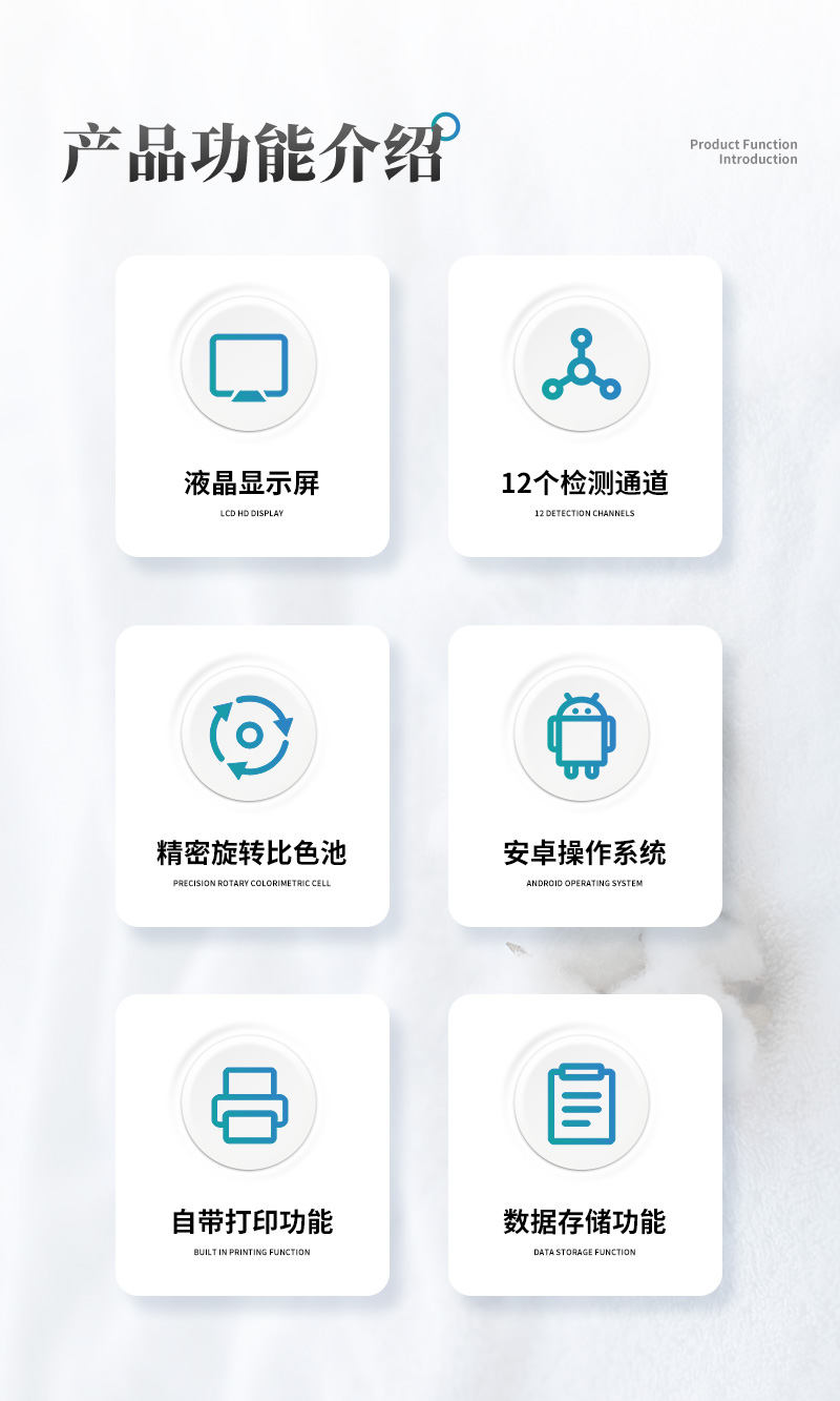 | 該儀器采用ARM Cortex-A7,RK3288/4核處理器,搭配運(yùn)行安卓智能操作系統(tǒng),集實(shí)驗(yàn)操作,分析結(jié)果,打印報(bào)告等功能于一體,使用方便,性能更強(qiáng)。 | 儀器采用7.1英寸液晶觸摸屏,單機(jī)即可操作,無需連接外部顯示設(shè)備或控制裝置。 | 設(shè)備具有12個(gè)檢測(cè)通道,可一次性檢測(cè)11個(gè)樣品,效率更高。 | 儀器采用精密旋轉(zhuǎn)比色池設(shè)計(jì),使用同光源校準(zhǔn)精度,檢測(cè)結(jié)果更為準(zhǔn)確**。 | 設(shè)備具有數(shù)據(jù)存儲(chǔ)功能,設(shè)備可以存儲(chǔ)數(shù)據(jù)100000組,可在屏幕上直觀查看歷史數(shù)據(jù),可導(dǎo)出數(shù)據(jù)。 | 設(shè)備自帶打印功能,可對(duì)樣品信息及檢測(cè)結(jié)果無限次隨意打印。 | 該儀器模塊化高度集成,同步設(shè)有數(shù)字化管理模塊、無線通訊模塊,可將檢測(cè)結(jié)果進(jìn)行分析,直接上傳至數(shù)據(jù)平臺(tái),實(shí)現(xiàn)數(shù)據(jù)共享,方便后期進(jìn)行數(shù)據(jù)分析與統(tǒng)計(jì)。 | 儀器采用高度智能化系統(tǒng),儀器自動(dòng)對(duì)檢測(cè)結(jié)果與國(guó)標(biāo)限量值進(jìn)行對(duì)比,自動(dòng)判定樣品是否合格,結(jié)果更為直觀。 | 本設(shè)備可以針對(duì)檢測(cè)樣品信息,對(duì)每個(gè)通道屬性單獨(dú)進(jìn)行編輯,例如受檢單位,檢測(cè)人員等。 | 設(shè)備具有過壓保護(hù)、防靜電干擾、防磁場(chǎng)干擾等功能 | 該設(shè)備可進(jìn)行技術(shù)性遠(yuǎn)程升級(jí),更新程序,無需返廠,并且后期我司將持續(xù)免費(fèi)更新系統(tǒng)版本,降低使用成本及運(yùn)輸損耗風(fēng)險(xiǎn)。 |