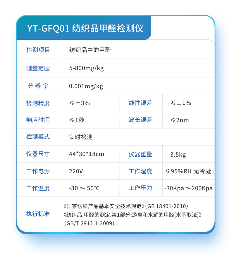 | 紡織品中的甲醛 | 5-800mg/kg | 0.001mg/kg | ≤±3% | ≤1秒 | 實(shí)時(shí)檢測(cè) | 44*30*18cm | 220V | -30 ~ 50℃ | -30Kpa ~ 200Kpa | ≤±1% | ≤2nm | 3.5kg | ≤95%RH,無冷凝 | 《國(guó)家紡織產(chǎn)品基本安全技術(shù)規(guī)范》(GB 18401-2010) 《紡織品.甲醛的測(cè)定.第1部分:游離和水解的甲醛(水萃取法)》(GB/T 2912.1-2009) |
