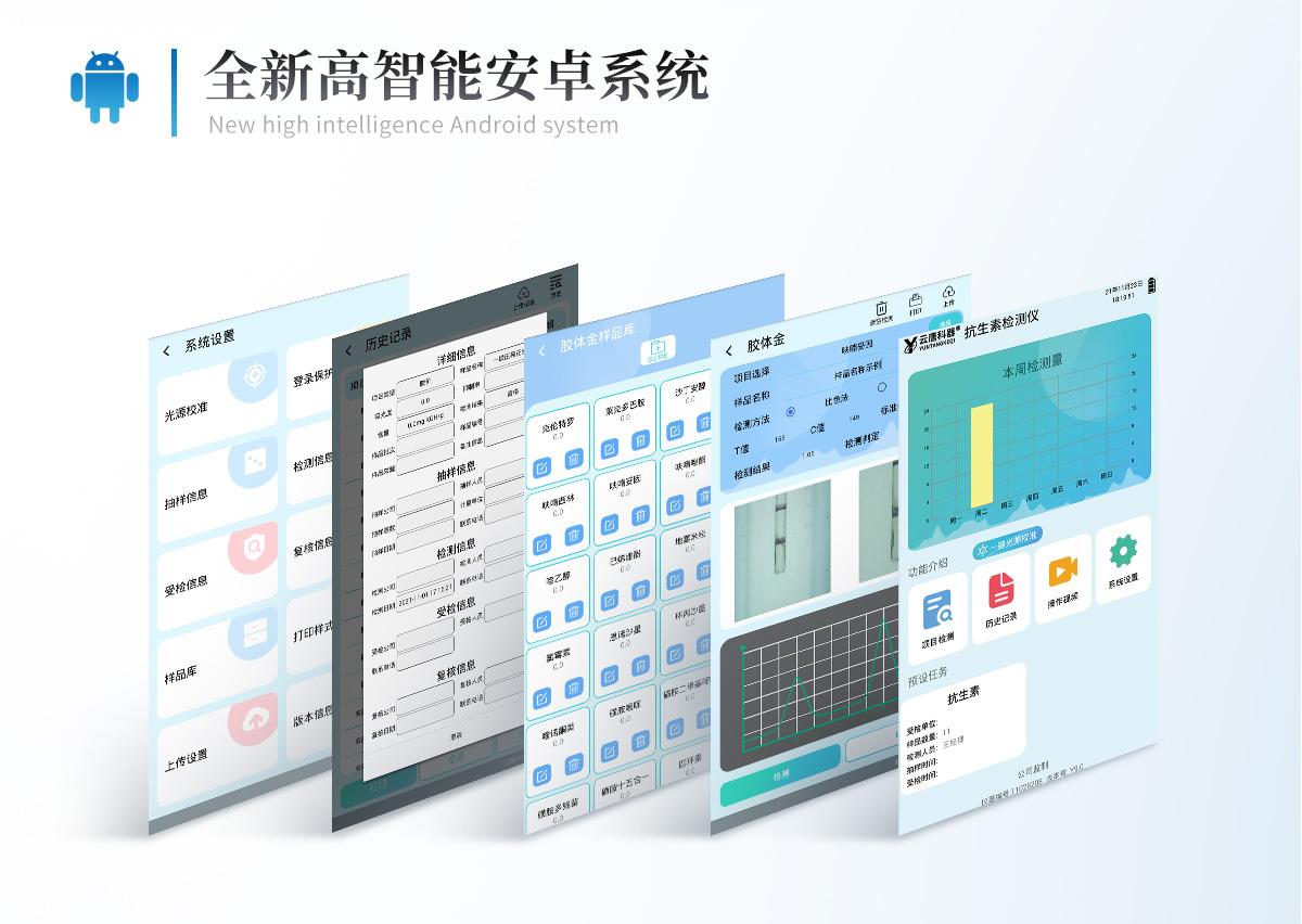 | 儀器采用10.1英寸液晶觸摸屏顯,搭配運(yùn)行安卓智能操作系統(tǒng),主控芯片采用ARM Cortex-A7,RK3288/4核處理器,主頻1.88Ghz,運(yùn)轉(zhuǎn)速度更快速,性能更強(qiáng)。 | 儀器功能包括:膠體金檢測(cè)模塊、數(shù)字化管理模塊、無(wú)線通訊模塊等,可以滿足同一軟件下實(shí)現(xiàn)所有檢測(cè)項(xiàng)目的檢測(cè),并在同一窗口展示檢測(cè)結(jié)果。 | 一體化臺(tái)式快檢設(shè)備,采用交直流兩用供電方式,可連接車(chē)載電源,配備6ah大容量充電鋰電池,可以滿足現(xiàn)場(chǎng)及流動(dòng)檢測(cè)使用的需求。儀器尺寸:43×35×20cm, 主機(jī)凈重:5.1kg | 系統(tǒng)自帶數(shù)據(jù)集成模塊,設(shè)備首頁(yè)自動(dòng)統(tǒng)計(jì)檢測(cè)數(shù)據(jù)包含:周檢測(cè)數(shù)據(jù)、月檢測(cè)數(shù)據(jù),全部檢測(cè)總數(shù)量,均包含檢測(cè)總數(shù),合格數(shù),不合格數(shù),以及相關(guān)柱形分析圖,對(duì)各項(xiàng)檢測(cè)數(shù)據(jù)清晰掌握,無(wú)需電腦查詢(xún),更加快捷直觀。 | 儀器具有任務(wù)預(yù)設(shè)模塊,可在樣品送檢前提前預(yù)設(shè)樣品名稱(chēng)、檢測(cè)指標(biāo)、送檢單位等信息,樣品送檢時(shí)一鍵調(diào)取保存信息,檢測(cè)更加方便快捷。 | 直插式自動(dòng)掃描方式,可實(shí)時(shí)顯示金標(biāo)卡實(shí)時(shí)圖像,系統(tǒng)自動(dòng)分析并呈現(xiàn)出CT曲線圖,CT線自動(dòng)識(shí)別,無(wú)需手動(dòng)調(diào)整,完成檢測(cè)后自動(dòng)退出檢測(cè)卡。 | 結(jié)果判定線可修改,對(duì)照值標(biāo)定值可保存,斷電不丟失數(shù)據(jù)。 | 兼容市場(chǎng)上其他膠體金卡,使用耗材不受限制,極大增強(qiáng)用戶(hù)使用體驗(yàn)。 | 儀器檢測(cè)系統(tǒng)擁有龐大數(shù)據(jù)庫(kù),并且構(gòu)建了完善的檢索、修訂功能。食品庫(kù)涵蓋多種樣品名稱(chēng),可按需添加或刪除、編輯樣品名稱(chēng);產(chǎn)品數(shù)據(jù)庫(kù)以及歷史檢測(cè)記錄支持一鍵檢索功能。 | 系統(tǒng)打印自定義化,打印格式多樣化,產(chǎn)品合格證(國(guó)家標(biāo)準(zhǔn)要求),二維碼,抽樣信息、檢測(cè)信息,受檢信息、復(fù)核信息、抽樣日期、檢測(cè)日期等信息結(jié)果,可按需求自行設(shè)置打印內(nèi)容。 | A4紙版本報(bào)告打印功能(可選配):設(shè)備擁有兩種結(jié)果展示方式,可以自動(dòng)生成A4打印模板和小票打印模板兩種樣式,可通過(guò)WiFi及網(wǎng)線等方式鏈接外置打印機(jī)可進(jìn)行打印 | 儀器具有 wifi 聯(lián)網(wǎng)上傳、RJ45網(wǎng)線連接功能,可以快速上傳數(shù)據(jù)。同步對(duì)接監(jiān)管平臺(tái),數(shù)據(jù)可局域網(wǎng)和互聯(lián)網(wǎng)數(shù)據(jù)上傳,檢測(cè)結(jié)果直接傳至食品安全監(jiān)管平臺(tái)。進(jìn)行區(qū)域食品安全監(jiān)管及大數(shù)據(jù)分析處理與數(shù)據(jù)統(tǒng)計(jì),檢測(cè)區(qū)域食品安全長(zhǎng)短期動(dòng)態(tài),達(dá)到食品安全問(wèn)題預(yù)估、預(yù)警。 | 設(shè)備支持U盤(pán)存儲(chǔ),標(biāo)準(zhǔn)USB接口,免驅(qū)動(dòng)安裝。檢測(cè)結(jié)果存儲(chǔ)容量20萬(wàn)條以上,可生成Excel表格,進(jìn)行一鍵拷貝,并具有登錄保護(hù)功能,可設(shè)置用戶(hù)名及密碼,規(guī)范不同人員操作權(quán)限,防止非工作人員操作,并且可以進(jìn)行重新校準(zhǔn)、鎖定、恢復(fù)出廠設(shè)置功能。儀器固件可升級(jí),后期檢測(cè)項(xiàng)目可擴(kuò)充。 | 儀器具有重新校準(zhǔn)、鎖定、恢復(fù)出廠設(shè)置功能。 | 儀器具備遠(yuǎn)程升級(jí)功能,可定向分客戶(hù)分儀器更新,開(kāi)機(jī)后自動(dòng)更新,并可持續(xù)性免費(fèi)更新系統(tǒng)版本,無(wú)需像傳統(tǒng)產(chǎn)品返廠更新,節(jié)省時(shí)間及人力成本并避免了物流運(yùn)輸返廠升級(jí)導(dǎo)致設(shè)備損壞的潛在風(fēng)險(xiǎn)。 |