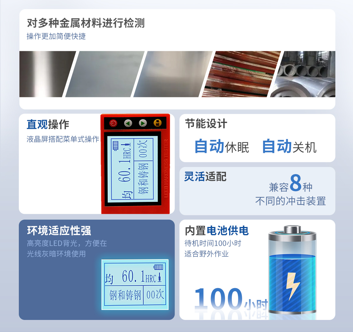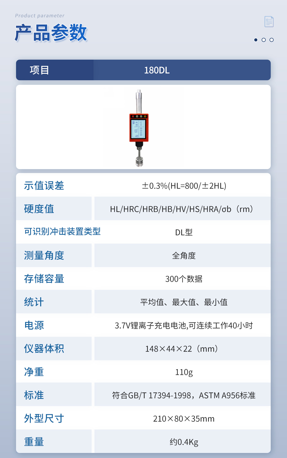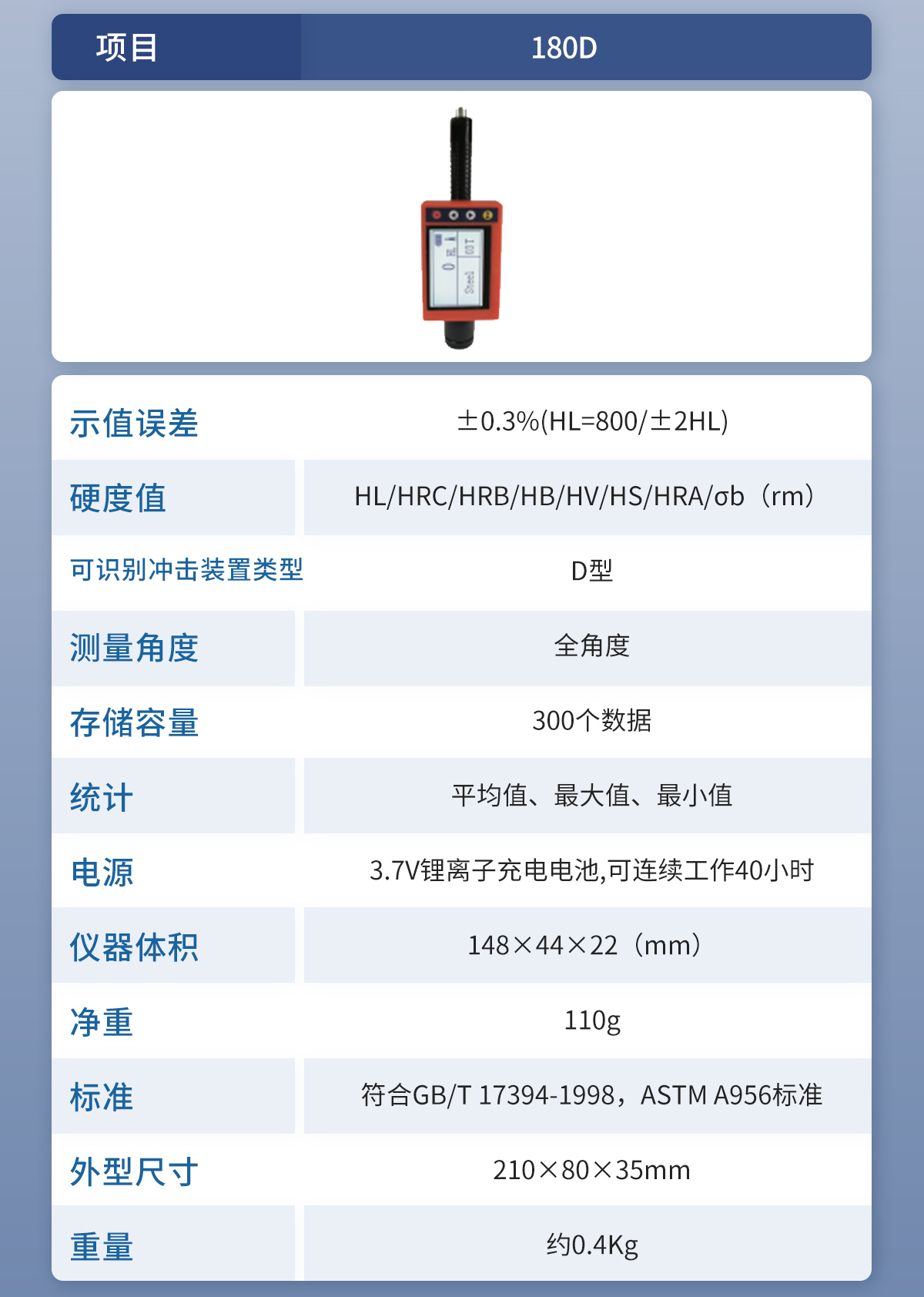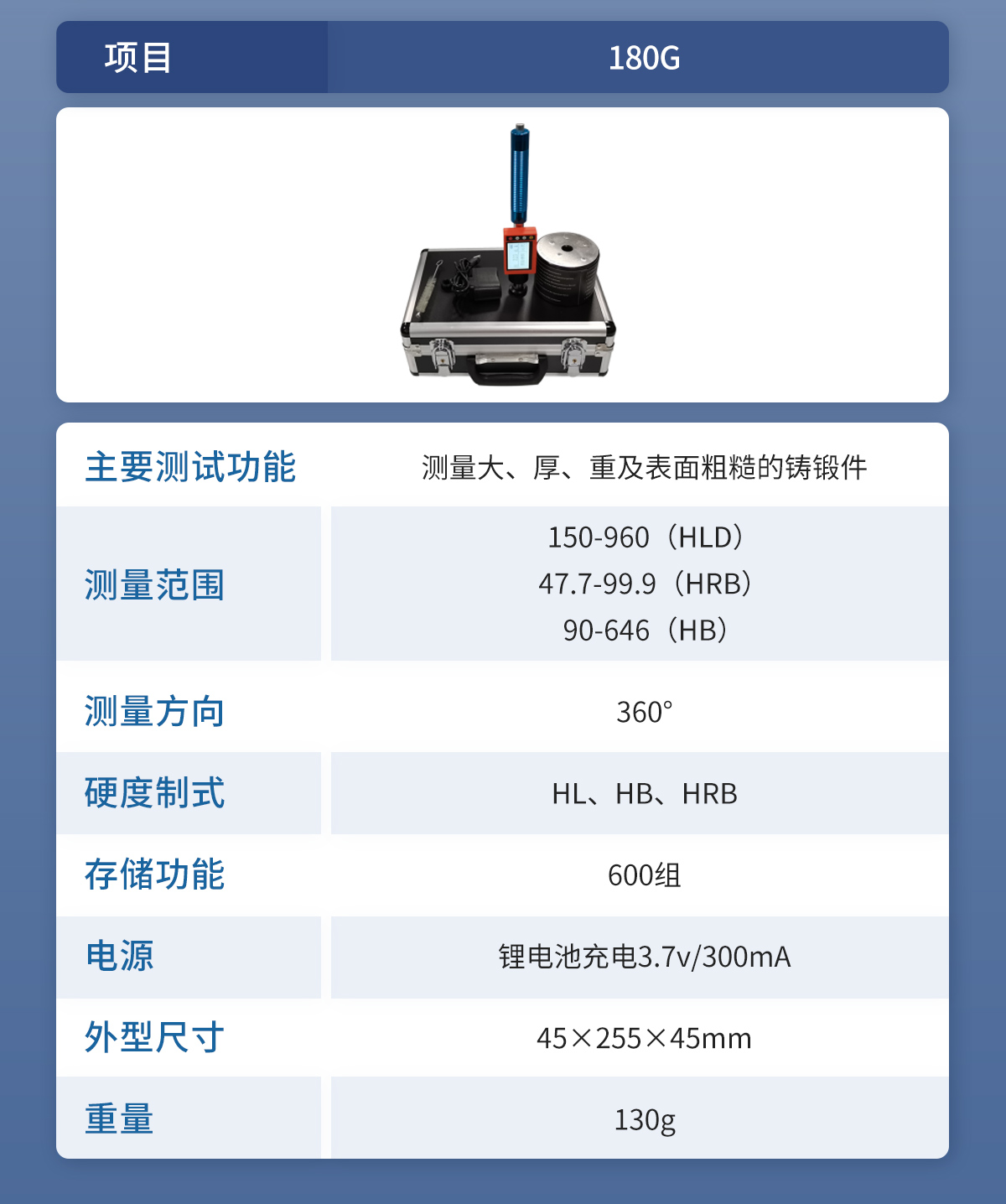 | 測(cè)量范圍 | 150-960(HLD)、47.7-99.9(HRB)、90-646(HB) |