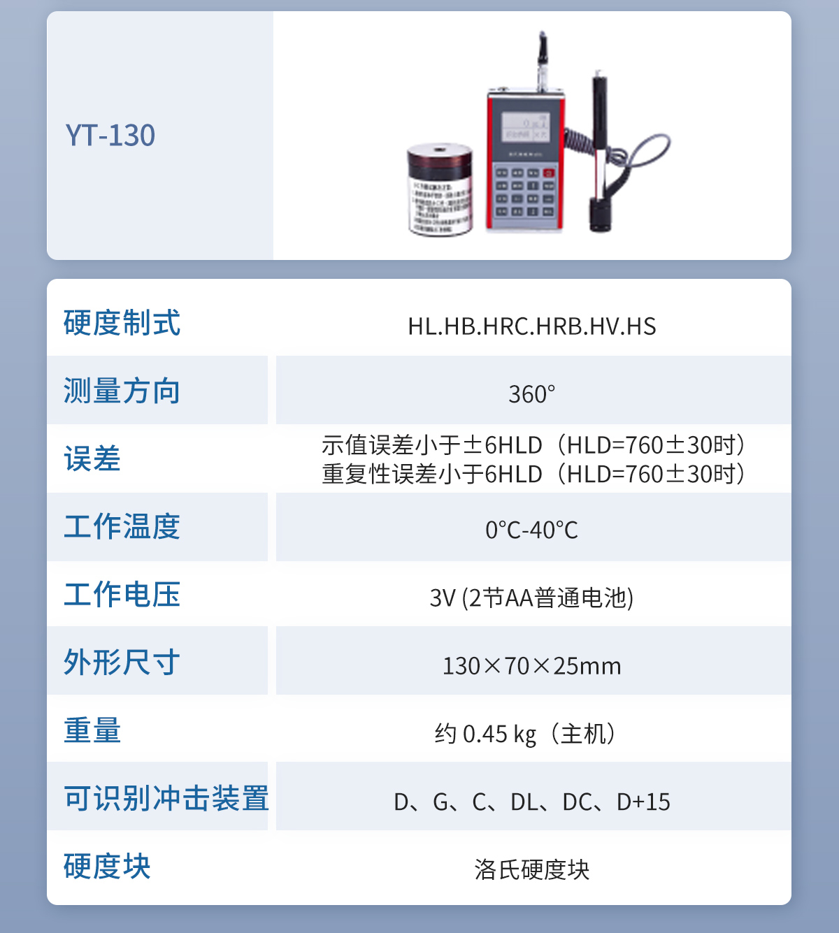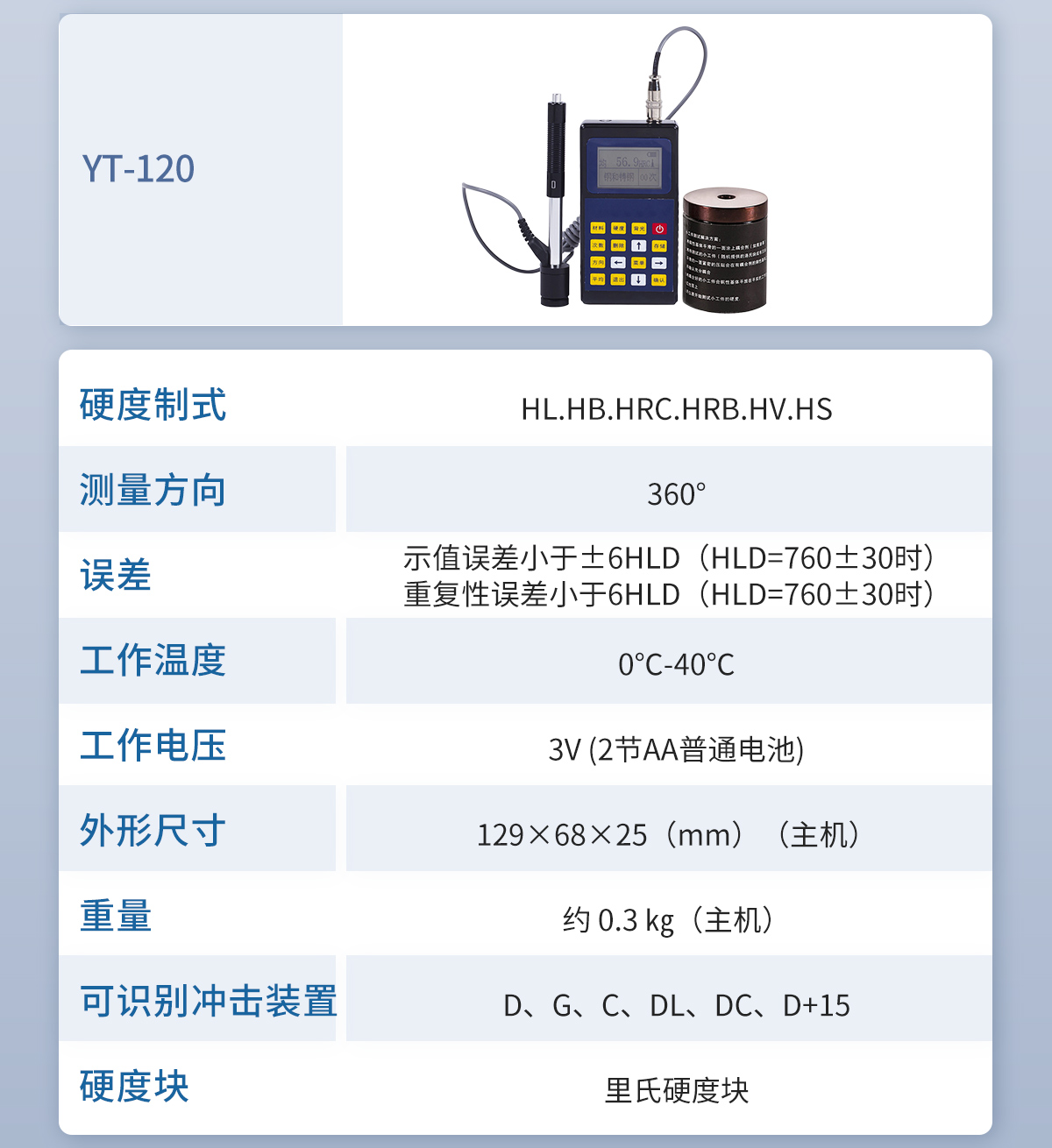 YT-120 里氏硬度計(jì)是我公司生產(chǎn)的多功能的硬度測(cè)量?jī)x器。使用全中文顯示,菜單式操作,操作簡(jiǎn)單、方便。本機(jī)可直接;顯示里氏、布氏、洛氏、維氏、肖氏等各種硬度值。儀器小巧、便攜、可靠性高,適用于惡劣的操作環(huán)境,抗振動(dòng)、沖擊和電磁干擾。