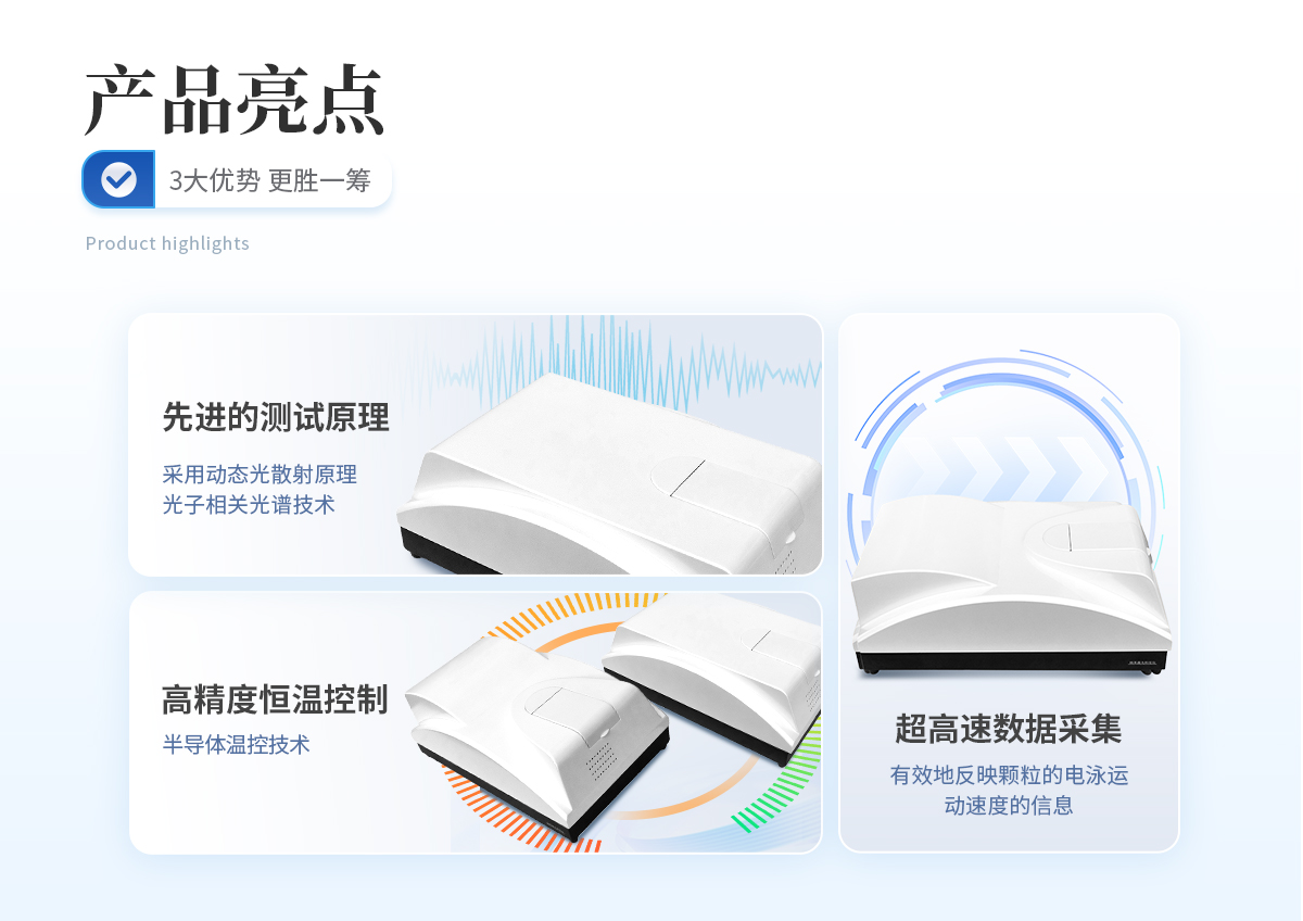 | 雙波長激光器,全自動切換 獨家采用雙波長(λ= 405nm、λ= 532nm)激光器搭建而成的光路系統(tǒng),相關(guān)譜探測系統(tǒng)不僅體積小,而且具有很強的抗干擾能力,從而保證了測試的穩(wěn)定性;對某些具有吸光屬性,傳統(tǒng)單一波長激光器無法檢測的樣品,可進行有效檢測; | **的測試原理 采用動態(tài)光散射原理和光子相關(guān)光譜技術(shù),根據(jù)顆粒在液體中的布朗運動速度測定顆粒大小。大小顆粒運動速度不同,激光照射這些顆粒,不同大小的顆粒將使散射光發(fā)生快慢不同的漲落起伏。光子相關(guān)光譜法就根據(jù)特定方向的光子漲落起伏分析其顆粒大小。 | 超高速數(shù)據(jù)采集 使用PCS技術(shù)測定納米級顆粒大小,必須能夠分辨納秒級信號起伏。本儀器的核心部件采用我公司研制的CR256數(shù)字相關(guān)器,具有識別8ns的**分辨能力和**的信號處理速度,其數(shù)據(jù)處理速度高達162M。它能實時完成動態(tài)散射光強的采集和自相關(guān)函數(shù)運算,從而有效地反映不同大小顆粒的動態(tài)分光散射信息,為測試結(jié)果的準確性典型基礎(chǔ)。 | 高靈敏度和信噪比 采用專業(yè)級高性能光電倍增管,對光子信號具有**的靈敏度和信噪比。 | 高精度雙溫控保護系統(tǒng) 采用半導(dǎo)體溫控技術(shù),樣品池溫控系統(tǒng)和激光器溫控系統(tǒng)精度高達±0.1℃,使被測樣品和激光器光源在整個測試過程中都處于恒溫狀態(tài),避免溫度變化對不測試結(jié)果的影響,確保測試準確和重復(fù); | 穩(wěn)定的光路系統(tǒng) 采用光纖技術(shù)搭建而成的光路系統(tǒng),使光子相關(guān)譜探測系統(tǒng)不僅體積小,而且具有很強的抗干擾能力,從而保證了測試的穩(wěn)定性。 |