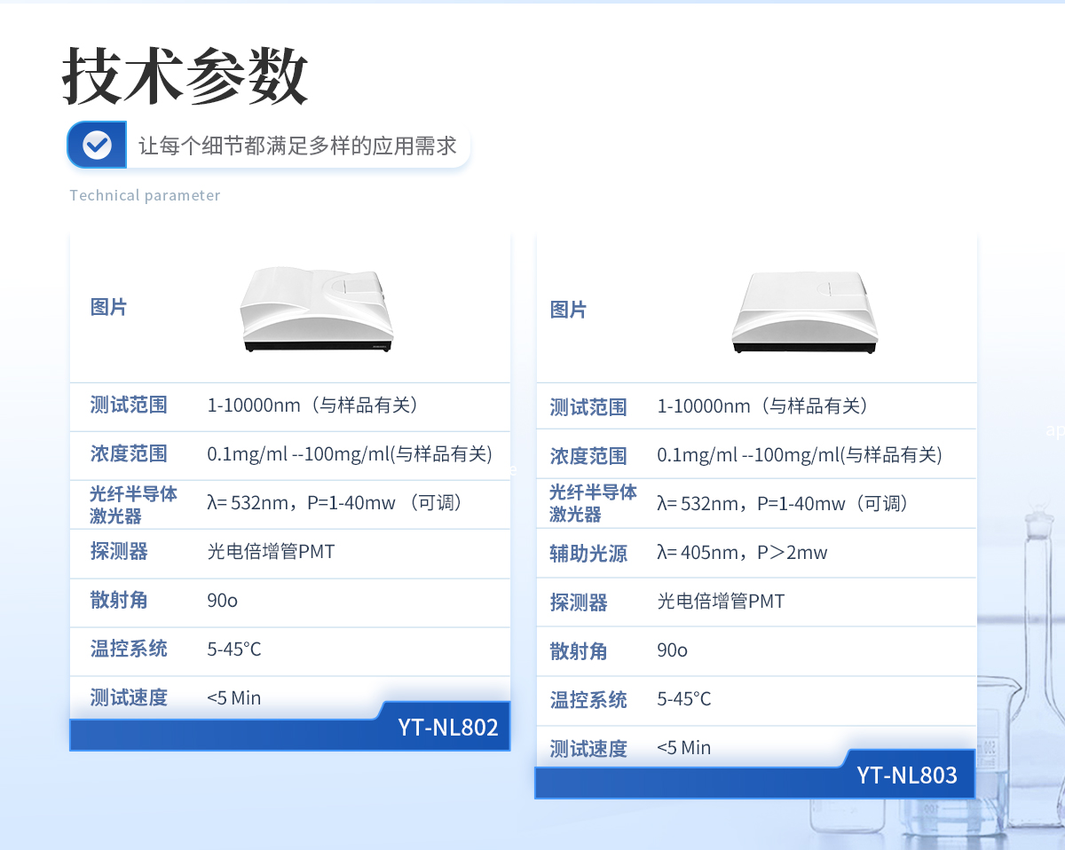 | 規(guī)格型號:YT-NL802 | 執(zhí)行標準:GB/T 19627-2005/ISO 13321-1996 GB/T 29022-2012/ISO 22412-2008 | 測試范圍 :1-10000nm(與樣品有關(guān)) | 濃度范圍:0.1mg/ml--100mg/ml(與樣品有關(guān)) | 準確度誤差:<1%(國家標準樣品D50值) | 重復(fù)性誤差:<1%(國家標準樣品D50值) | 激光光源:光纖半導(dǎo)體激光器,λ= 532nm,P=1-40mw (可調(diào)) | 探測器:光電倍增管PMT | 散射角:90o | 樣品池體積:10mm*10mm*40mm, 1--4mL | 溫控范圍:5-45℃ | 溫控精度:0.1℃ | 測試速度:<5 Min | 數(shù)字相關(guān)器主要參數(shù): (1)規(guī)格型號 CR256 (2)自相關(guān)通道 256 (3)基線通道 4 (4)物理通道數(shù) 5000 (5)延遲時間 100ns-10ms(可調(diào)) | 體積:480mm*270mm*170mm | 重量:12Kg |