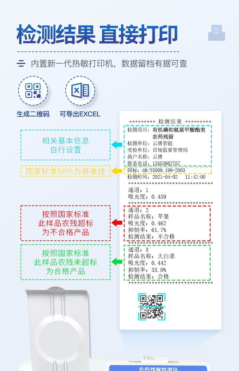 | 乙酰膽堿酯酶和丁酰膽堿酯酶試劑均可以使用,符合國(guó)家標(biāo)準(zhǔn)和農(nóng)業(yè)部標(biāo)準(zhǔn)的要求。 | 自動(dòng)判斷樣品是否合格,檢測(cè)結(jié)果更加直觀。 | 儀器具有100多種蔬菜名稱菜單庫,分類管理,并可按需添加或刪除蔬菜名,編輯蔬菜名稱,可直接打印出蔬菜名稱。 | 檢測(cè)通道:8個(gè)檢測(cè)通道,可以同時(shí)測(cè)試多個(gè)樣品,循環(huán)檢測(cè),即放即檢,每個(gè)樣品由程序控制分別獨(dú)立工作,不會(huì)互相干擾。 | 智能操作系統(tǒng),采用更加人性化操作,主控采用多核處理器,主頻1.88Ghz,運(yùn)轉(zhuǎn)速度更快速,穩(wěn)定性更強(qiáng)。 | 顯示方式:7英寸高靈敏真彩觸摸屏顯示,人性化中文操作界面,讀數(shù)直觀、簡(jiǎn)單。 | 打印機(jī)采用串口5v打印,可選擇手動(dòng)打印或者自動(dòng)打印,三分鐘出打印結(jié)果,打印格式為檢測(cè)人姓名、吸光度差值、檢測(cè)時(shí)間、檢測(cè)機(jī)構(gòu)、樣品名稱及結(jié)果判定。 | 光源采用進(jìn)口超高亮發(fā)光二極管,具有低功耗、高精度、穩(wěn)定性強(qiáng)、光源可控可以關(guān)掉不使用的光源,響應(yīng)速度快等優(yōu)點(diǎn)。 | 智能恒流穩(wěn)壓,光強(qiáng)自動(dòng)校準(zhǔn),長(zhǎng)時(shí)間連續(xù)工作光源無溫漂現(xiàn)象。 | 儀器具有GPRS遠(yuǎn)傳功能,可插手機(jī)卡實(shí)現(xiàn)數(shù)據(jù)遠(yuǎn)傳平臺(tái),wifi聯(lián)網(wǎng)功能,可將數(shù)據(jù)快速上傳電腦,進(jìn)行數(shù)據(jù)管理與統(tǒng)計(jì)。 | 采用USB2.0接口設(shè)計(jì),方便數(shù)據(jù)的存貯和移動(dòng),并可隨時(shí)與計(jì)算機(jī)直接相連,并且可用計(jì)算機(jī)控制儀器。實(shí)現(xiàn)數(shù)據(jù)查詢、瀏覽、分析、統(tǒng)計(jì)、打印等。 | 智能化程度高,儀器具有自檢功能:具有開機(jī)自檢和調(diào)零功能,具有自動(dòng)檢測(cè)重復(fù)性功能 | 儀器具有自身保護(hù)功能,可設(shè)置用戶名及密碼,防止非工作人員操作等。 | 采用DC12v直流供電,安全系統(tǒng)更高,并且配備6A鋰電池充電器。 | 儀器具有重新校準(zhǔn)、鎖定、恢復(fù)出廠設(shè)置功能。 |