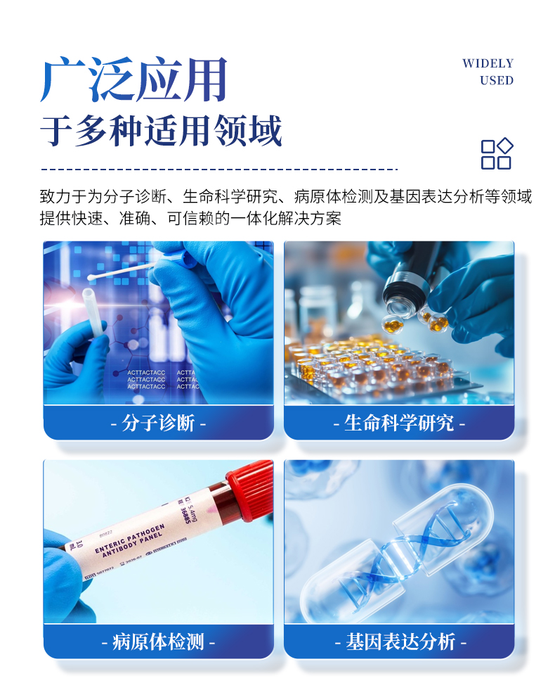 基礎(chǔ)科學(xué)研究、病原體檢測、肉制品摻假、轉(zhuǎn)基因檢測、食品安全檢測、藥物開發(fā)及合理用藥、基因表達、水體監(jiān)測、松材線蟲檢測、寵物檢測、養(yǎng)殖業(yè)疫病檢測