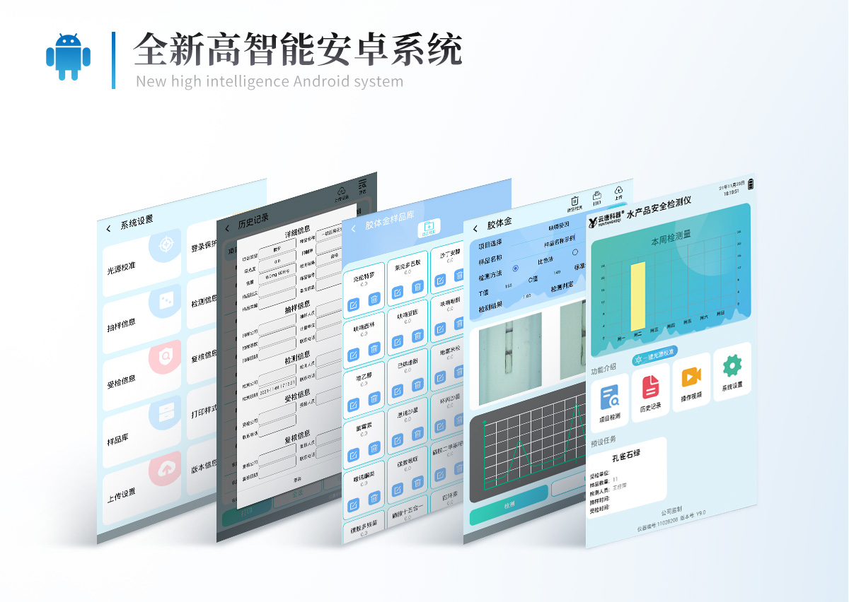 | 儀器采用10.1英寸液晶觸摸屏顯,搭配運(yùn)行安卓智能操作系統(tǒng),主控芯片采用ARM Cortex-A7,RK3288/4核處理器,主頻1.88Ghz,運(yùn)轉(zhuǎn)速度更快速,性能更強(qiáng)。 | 儀器功能包括:膠體金檢測模塊、數(shù)字化管理模塊、無線通訊模塊等,可以滿足同一軟件下實現(xiàn)所有檢測項目的檢測,并在同一窗口展示檢測結(jié)果。 | 一體化便攜式快檢設(shè)備,采用交直流兩用供電方式,可連接車載電源,配備6ah大容量充電鋰電池,可以滿足現(xiàn)場及流動檢測使用的需求。儀器尺寸:43×35×20cm, 主機(jī)凈重:5.1kg | 系統(tǒng)自帶數(shù)據(jù)集成模塊,設(shè)備首頁自動統(tǒng)計檢測數(shù)據(jù)包含:周檢測數(shù)據(jù)、月檢測數(shù)據(jù),全部檢測總數(shù)量,均包含檢測總數(shù),合格數(shù),不合格數(shù),以及相關(guān)柱形分析圖,對各項檢測數(shù)據(jù)清晰掌握,無需電腦查詢,更加快捷直觀。 | 儀器具有任務(wù)預(yù)設(shè)模塊,可在樣品送檢前提前預(yù)設(shè)樣品名稱、檢測指標(biāo)、送檢單位等信息,樣品送檢時一鍵調(diào)取保存信息,檢測更加方便快捷。 | 軌道式自動傳輸掃描方式,可實時顯示金標(biāo)卡實時圖像,系統(tǒng)自動分析并呈現(xiàn)出CT曲線圖,CT線自動識別,無需手動調(diào)整,完成檢測后自動退出檢測卡。 | 結(jié)果判定線可修改,對照值標(biāo)定值可保存,斷電不丟失數(shù)據(jù)。 | 兼容市場上其他膠體金卡,使用耗材不受限制,極大增強(qiáng)用戶使用體驗。 | 儀器檢測系統(tǒng)擁有龐大數(shù)據(jù)庫,并且構(gòu)建了完善的檢索、修訂功能。食品庫涵蓋多種樣品名稱,可按需添加或刪除、編輯樣品名稱;產(chǎn)品數(shù)據(jù)庫以及歷史檢測記錄支持一鍵檢索功能。 | 系統(tǒng)打印自定義化,打印格式多樣化,產(chǎn)品合格證(國家標(biāo)準(zhǔn)要求),二維碼,抽樣信息、檢測信息,受檢信息、復(fù)核信息、抽樣日期、檢測日期等信息結(jié)果,可按需求自行設(shè)置打印內(nèi)容。 | A4紙版本報告打印功能(可選配):設(shè)備擁有兩種結(jié)果展示方式,可以自動生成A4打印模板和小票打印模板兩種樣式,可通過WiFi及網(wǎng)線等方式鏈接外置打印機(jī)可進(jìn)行打印 | 儀器具有 wifi 聯(lián)網(wǎng)上傳、RJ45網(wǎng)線連接功能,可以快速上傳數(shù)據(jù)。同步對接監(jiān)管平臺,數(shù)據(jù)可局域網(wǎng)和互聯(lián)網(wǎng)數(shù)據(jù)上傳,檢測結(jié)果直接傳至食品安全監(jiān)管平臺。進(jìn)行區(qū)域食品安全監(jiān)管及大數(shù)據(jù)分析處理與數(shù)據(jù)統(tǒng)計,檢測區(qū)域食品安全長短期動態(tài),達(dá)到食品安全問題預(yù)估、預(yù)警。 | 設(shè)備支持U盤存儲,標(biāo)準(zhǔn)USB接口,免驅(qū)動安裝。檢測結(jié)果存儲容量20萬條以上,可生成Excel表格,進(jìn)行一鍵拷貝,并具有登錄保護(hù)功能,可設(shè)置用戶名及密碼,規(guī)范不同人員操作權(quán)限,防止非工作人員操作,并且可以進(jìn)行重新校準(zhǔn)、鎖定、恢復(fù)出廠設(shè)置功能。儀器固件可升級,后期檢測項目可擴(kuò)充。 | 儀器具有重新校準(zhǔn)、鎖定、恢復(fù)出廠設(shè)置功能。 | 儀器具備遠(yuǎn)程升級功能,可定向分客戶分儀器更新,開機(jī)后自動更新,并可持續(xù)性免費(fèi)更新系統(tǒng)版本,無需像傳統(tǒng)產(chǎn)品返廠更新,節(jié)省時間及人力成本并避免了物流運(yùn)輸返廠升級導(dǎo)致設(shè)備損壞的潛在風(fēng)險。 |