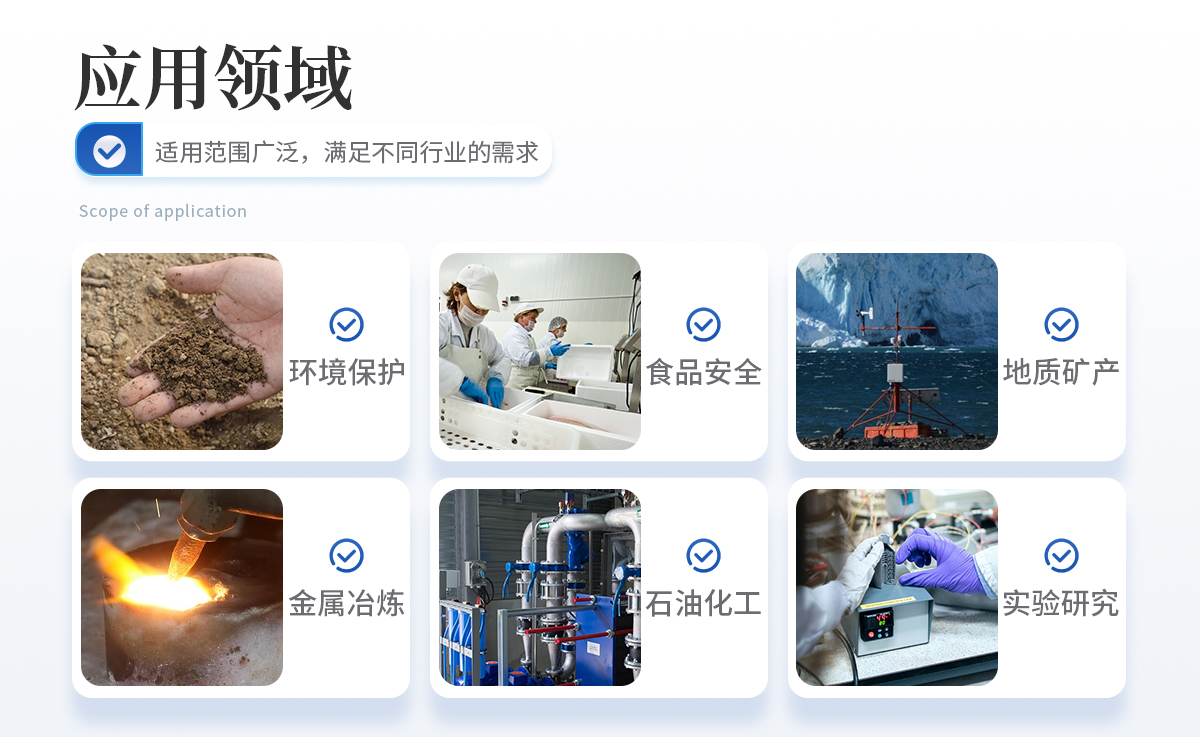 原子熒光光譜儀的應用領域較為廣泛,主要測試樣品中 11 種超痕量元素的含量,**檢測下限可達千億分之一級。應用領域包括水質(zhì)、土壤、大氣等樣環(huán)境檢測項目、食品檢驗、檢驗檢疫、藥品檢驗、化妝品檢驗、土壤飼料肥料檢驗、地質(zhì)礦產(chǎn)測試、冶金樣品檢驗、教學研究等。