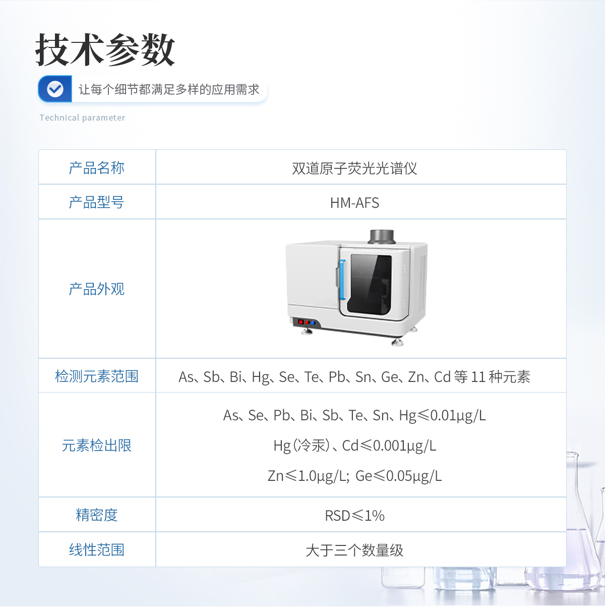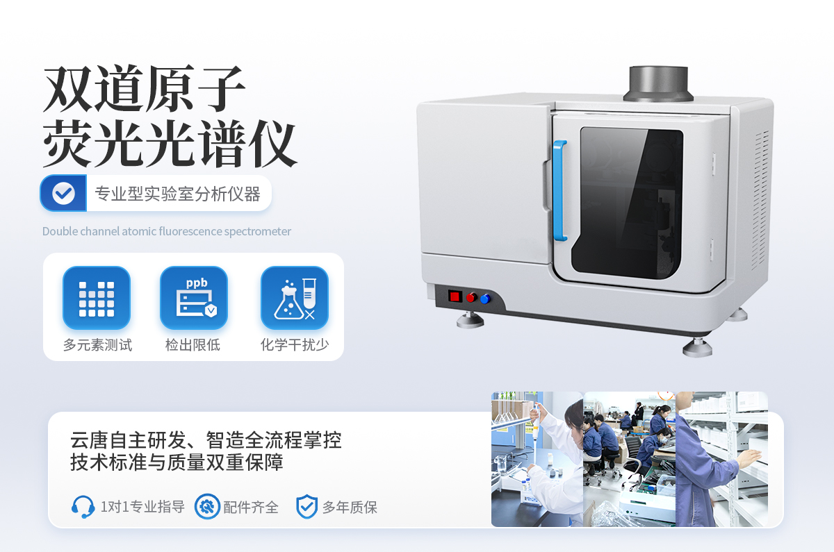 雙道原子熒光光譜儀廣泛應用于汞(Hg)、砷(As)、銻(Sb)、鉍(Bi)、硒(Se)、碲(Te)、鎘(Cd)、鍺(Ge)、鉛(Pb)、錫(Sn)、鋅(Zn)等11 種元素的痕量、超痕量分析,體積小巧,性能穩(wěn)定,操作簡單。