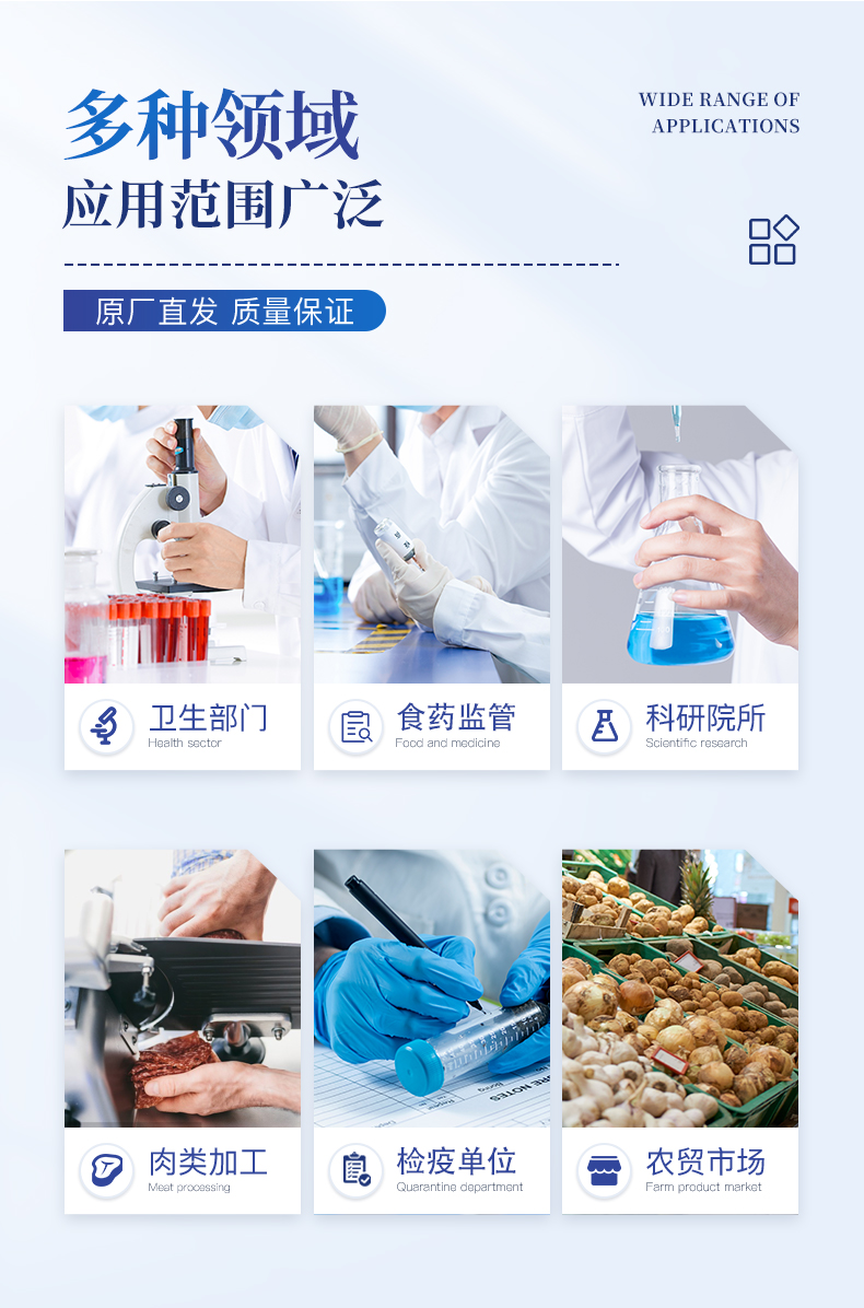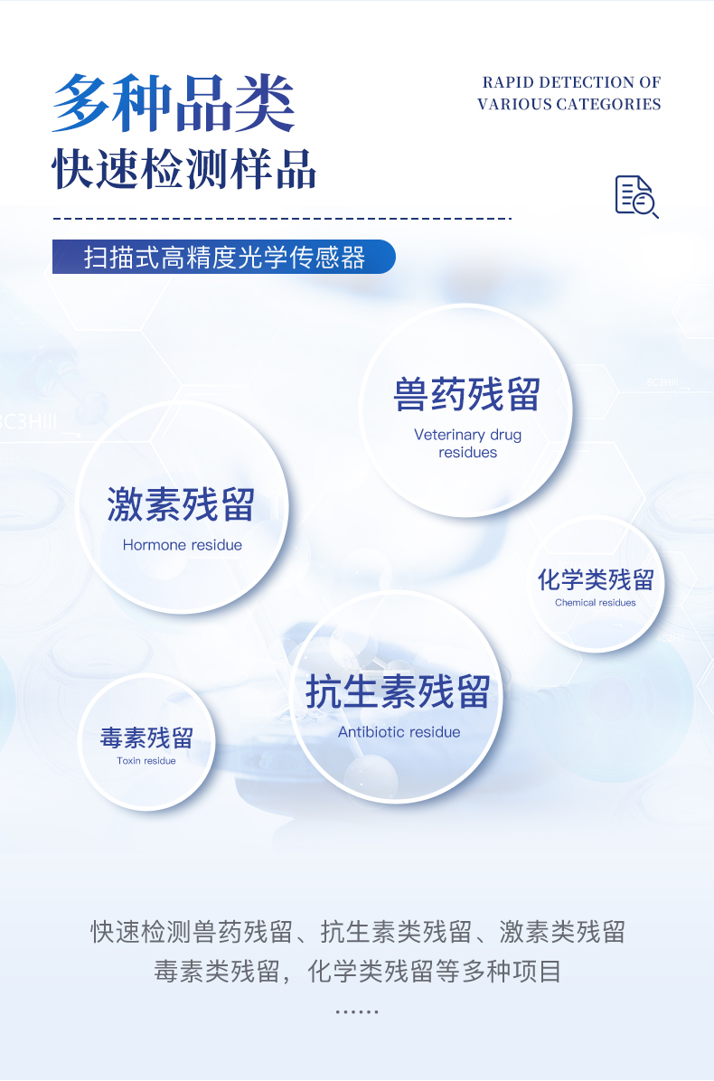 | 瘦肉精激素類(獸藥):鹽酸克倫特羅、沙丁胺醇、萊克多巴胺、己烯雌酚、喹乙醇等 | 抗生素殘留類(獸藥):四環(huán)素類、硝基呋喃類、磺胺類、沙星類、喹諾酮類、慶大霉素、鏈霉素、阿莫西林、紅霉素等 | 水產(chǎn)品安全類:孔雀石綠、氯霉素、呋喃妥因代謝、呋喃西林代謝、呋喃它酮代謝、呋喃唑酮代謝等 | 以及病害肉及肉類新鮮度的擴(kuò)展檢測。 |