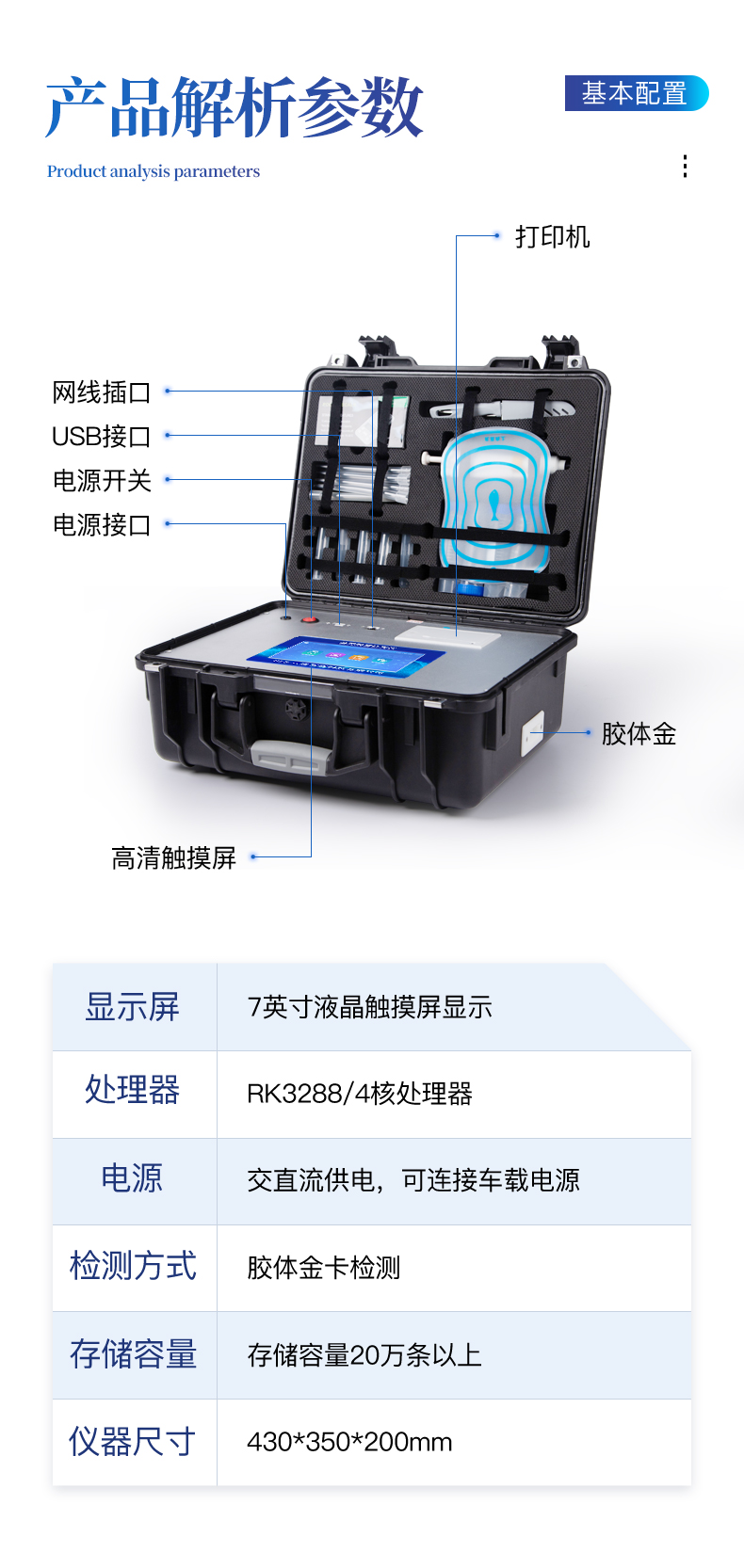 | 安卓智能操作系統(tǒng),采用更加**UI交互界面,儀器具有wifi聯(lián)網(wǎng)上傳、4G聯(lián)網(wǎng)傳輸、GPRS無線遠(yuǎn)傳、網(wǎng)線連接功能,快速批量上傳數(shù)據(jù)。 | 智能化程度高,儀器具有自檢功能:具有開機(jī)自檢和調(diào)零功能,具有自動(dòng)檢測重復(fù)性功能。 | 新一代高速熱敏打印機(jī),檢測完成可自動(dòng)打印檢測報(bào)告和二維碼。 | 儀器帶有監(jiān)管平臺,數(shù)據(jù)可局域網(wǎng)和互聯(lián)網(wǎng)數(shù)據(jù)上傳,檢測結(jié)果直接傳至食品安全監(jiān)管平臺。進(jìn)行區(qū)域食品安全監(jiān)管及大數(shù)據(jù)分析處理與數(shù)據(jù)統(tǒng)計(jì),檢測區(qū)域食品安全長短期動(dòng)態(tài),達(dá)到食品安全問題預(yù)估、預(yù)警 | 一體化便攜式快檢設(shè)備,滿足現(xiàn)場及流動(dòng)檢測使用需求,能夠在同一軟件下實(shí)現(xiàn)所有檢測項(xiàng)目的檢測,并可通過同一窗口直觀顯示檢測結(jié)果。 | 膠體金模塊檢測方式:軌道式自動(dòng)傳輸掃描,檢測完成后自動(dòng)退出檢測卡。 | 一體化主機(jī),包含食品安全檢測模塊、多通道農(nóng)藥殘留檢測模塊、膠體金免疫層析檢測模塊。 | CT線自動(dòng)識別,無需手動(dòng)調(diào)整。 | 儀器具有品類多種類樣品菜單庫,可靈活選擇檢測樣品,不同的檢測通道可同時(shí)檢測不同的樣品項(xiàng)目。。 | 樣品處理簡單省力,整體操作快速、安全、便捷。 | 儀器具有自身保護(hù)功能,可設(shè)置用戶名及密碼,防止非工作人員操作等。 | 高靈敏度,高檢測精度,高重復(fù)性精度,掃描式高精度光學(xué)傳感器。 | 儀器具有重新校準(zhǔn)、鎖定、恢復(fù)出廠設(shè)置功能。 | 內(nèi)置強(qiáng)大的數(shù)據(jù)庫,可在儀器上直接選擇樣品名稱、檢測指標(biāo)、送檢單位等信息,也可在儀器上直接編輯錄入樣品名稱、檢測指標(biāo)、送檢單位等信息并保存進(jìn)樣品數(shù)據(jù)庫。 | 儀器具有重新校準(zhǔn)、鎖定、恢復(fù)出廠設(shè)置功能。 | 結(jié)果判定線可修改,對照值標(biāo)定值可保存,斷電不丟失數(shù)據(jù)。 | 兼容市場上所有的膠體金卡,使用耗材不受限制,極大增強(qiáng)用戶使用體驗(yàn)。 |