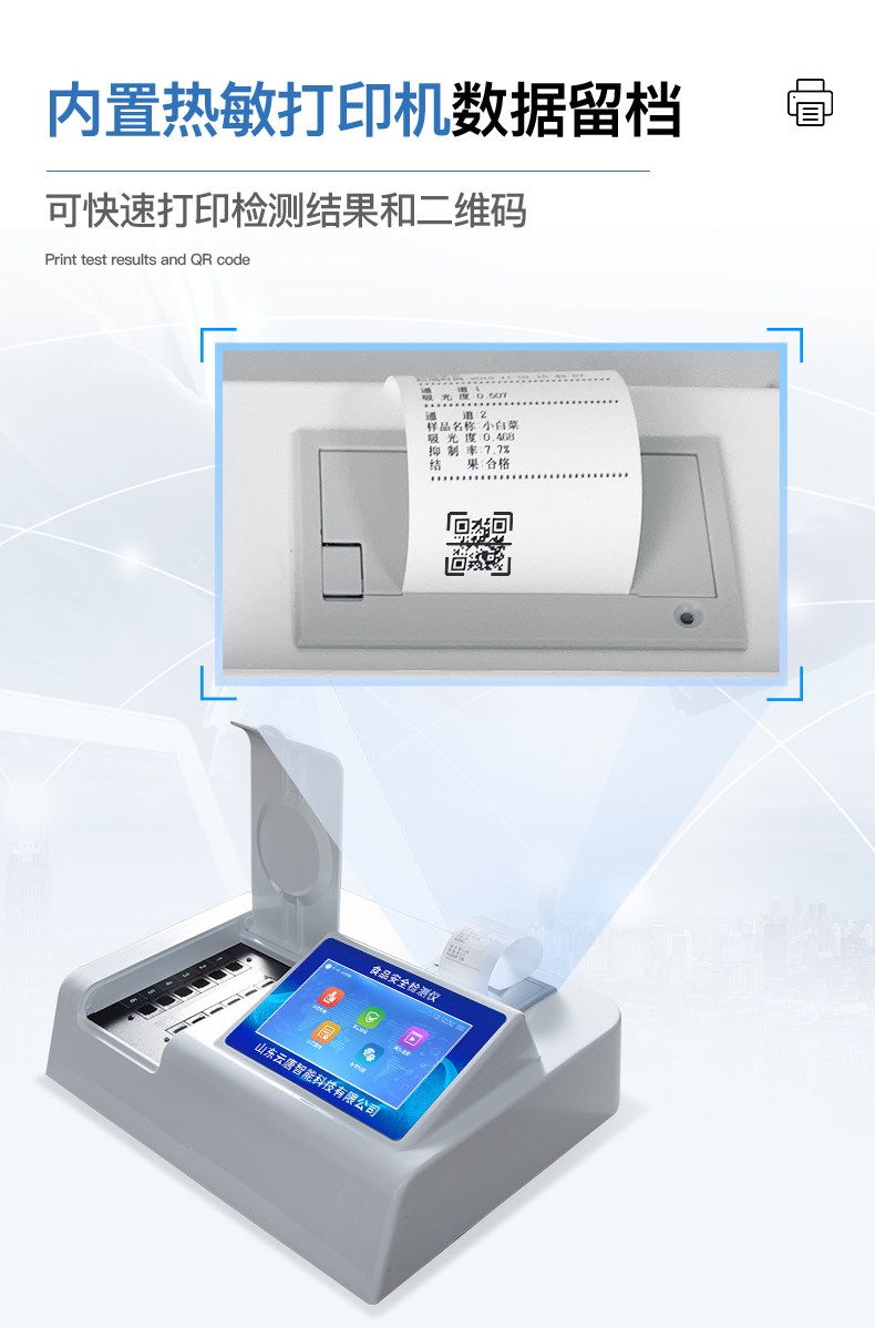 | 安卓智能操作系統(tǒng),采用更加**和人性化操作,儀器具有網(wǎng)線連接、wifi聯(lián)網(wǎng)上傳、GPRS無(wú)線遠(yuǎn)傳功能,快速上傳數(shù)據(jù)。 | 智能化程度高,儀器具有自檢功能:具有開(kāi)機(jī)自檢和調(diào)零功能,具有自動(dòng)檢測(cè)重復(fù)性功能。 | 檢測(cè)通道:≥12個(gè)檢測(cè)通道,可以同時(shí)測(cè)試多個(gè)樣品,每個(gè)樣品由程序控制分別獨(dú)立工作,不會(huì)互相干擾。 | 顯示方式:≥8英寸液晶觸摸屏顯示,人性化中文操作界面,讀數(shù)直觀、簡(jiǎn)單。 | 配備新一代嵌入式熱敏打印機(jī),可選擇手動(dòng)打印或者自動(dòng)打印,檢測(cè)完成可自動(dòng)打印檢測(cè)報(bào)告和二維碼。 | 光源采用進(jìn)口超高亮發(fā)光二極管,高精度、穩(wěn)定性強(qiáng)、光源可控、可以關(guān)掉不使用的光源,功耗更低。 | 采用USB2.0接口設(shè)計(jì),方便數(shù)據(jù)的存貯和移動(dòng),并可隨時(shí)與計(jì)算機(jī)直接相連,并且可用計(jì)算機(jī)控制儀器。實(shí)現(xiàn)數(shù)據(jù)查詢、瀏覽、分析、統(tǒng)計(jì)、打印等。 | 儀器帶有監(jiān)管平臺(tái)。數(shù)據(jù)可局域網(wǎng)和互聯(lián)網(wǎng)數(shù)據(jù)上傳,檢測(cè)結(jié)果直接傳至食品安全監(jiān)管平臺(tái)。進(jìn)行區(qū)域食品安全監(jiān)管及大數(shù)據(jù)分析處理,檢測(cè)區(qū)域食品安全長(zhǎng)短期動(dòng)態(tài),達(dá)到食品安全問(wèn)題預(yù)估、預(yù)警 | 一體化便攜式快檢設(shè)備,滿足現(xiàn)場(chǎng)及流動(dòng)檢測(cè)使用需求,能夠在同一軟件下實(shí)現(xiàn)所有檢測(cè)項(xiàng)目的檢測(cè),并可通過(guò)同一窗口直觀顯示檢測(cè)結(jié)果。 | 儀器具有多品類多種類樣品菜單庫(kù),可靈活選擇檢測(cè)樣品,不同的檢測(cè)通道可同時(shí)檢測(cè)不同的樣品項(xiàng)目。也可在儀器上直接編輯錄入樣品名稱、檢測(cè)指標(biāo)、送檢單位等信息并保存進(jìn)樣品數(shù)據(jù)庫(kù)。 | 樣品處理簡(jiǎn)單省力,整體操作快速、安全、便捷。 | 儀器具有自身保護(hù)功能,可設(shè)置用戶名及密碼,防止非工作人員操作等。 | 高靈敏度,高檢測(cè)精度,高重復(fù)性精度,掃描式高精度光學(xué)傳感器。 | 內(nèi)置強(qiáng)大的數(shù)據(jù)庫(kù),可在儀器上直接選擇樣品名稱、檢測(cè)指標(biāo)、送檢單位等信息,也可在儀器上直接編輯錄入樣品名稱、檢測(cè)指標(biāo)、送檢單位等信息并保存進(jìn)樣品數(shù)據(jù)庫(kù)。 | 儀器具有重新校準(zhǔn)、鎖定、恢復(fù)出廠設(shè)置功能。 | 支持U盤存儲(chǔ)。 結(jié)果判定線可修改,對(duì)照值標(biāo)定值可保存,斷電不丟失數(shù)據(jù)。 |
