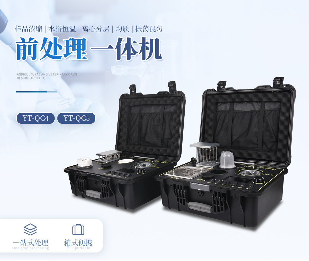 應(yīng)國內(nèi)用戶的實際需求,自行研制開發(fā)的新型儀器——QC05型樣品前處理一體機。樣品前處理集成箱將樣本前處理過程中樣品濃縮、水浴恒溫、離心分層、均質(zhì)、振蕩混勻等步驟所需設(shè)備進行集成,僅需一臺樣品前處理集成箱設(shè)備即可完成所有樣本前處理過程,并且方便攜帶,不僅適用于現(xiàn)場檢測使用,還可用于色譜、質(zhì)譜等分析樣品的純化和制備。