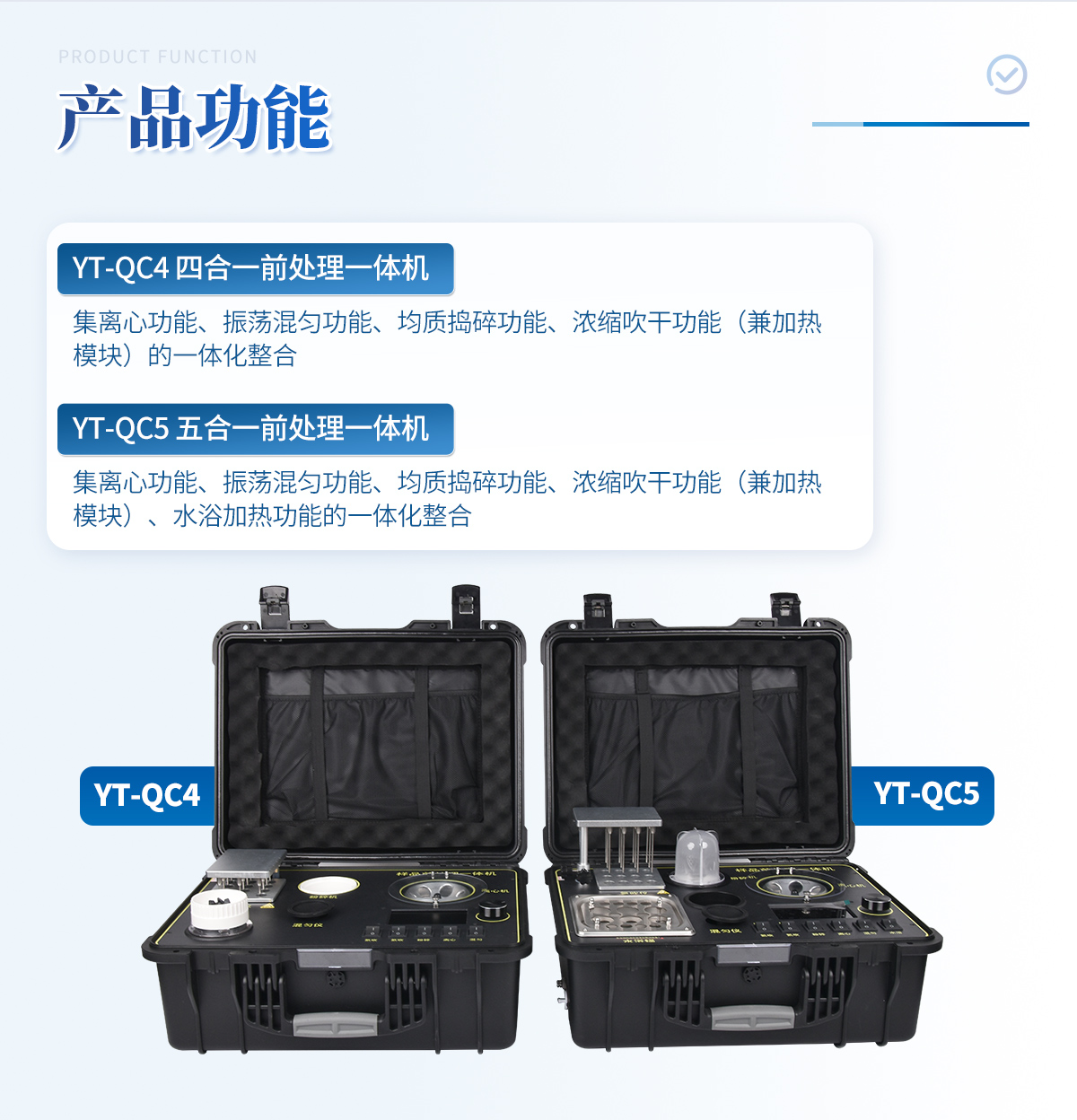 | 1、功能緊湊,集成五種樣品前處理常用的功能,完成樣品一站式處理。 | 2、結(jié)構(gòu)穩(wěn)固,機箱采用***工程塑料,具備**的抗沖擊性、耐腐蝕性、便攜性。 | 3、操作穩(wěn)定,機器采用五寸全彩色液晶屏,功能指示性強,用戶操作均為實體開關(guān),杜絕佩戴手套和液體噴濺時的操作失效。 |