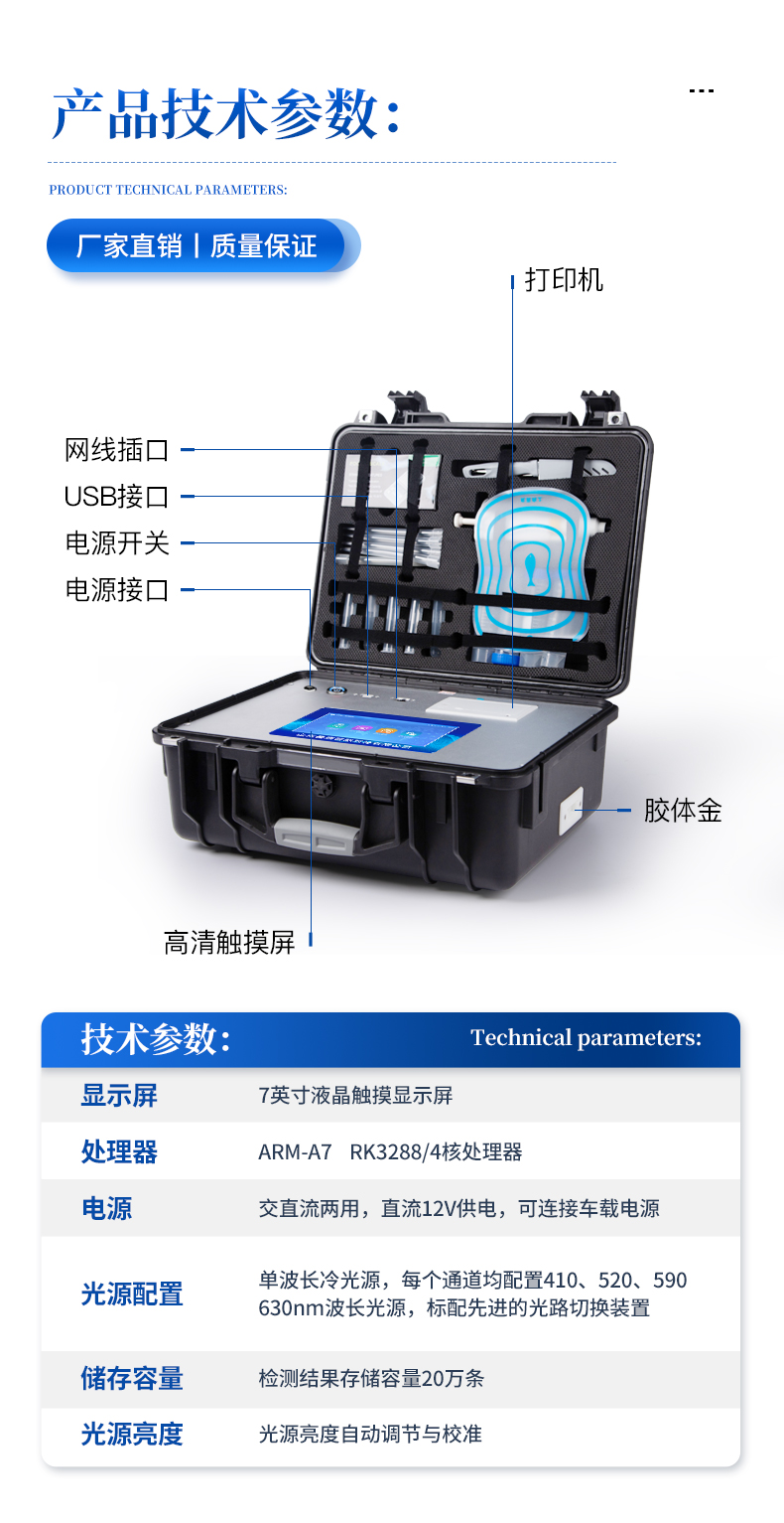 | 儀器采用手提式一體化系統(tǒng)檢測技術(shù),將分光光度模塊、新型農(nóng)殘檢測模塊、數(shù)字化管理模塊、無線通訊模塊高度集成于一體,支持檢測200種食品安全檢測項目,同時預(yù)留升級檢測方法。 | 儀器檢測模塊標準化、智能化,檢測項目可隨意自由組合。檢測箱體內(nèi)置多個標準檢測單元,檢測模塊可以調(diào)整配置。 | 顯示屏幕:儀器采用10.1英寸豎向液晶觸摸屏顯,搭配運行安卓智能操作系統(tǒng),主控芯片采用ARM Cortex-A7,RK3288/4核處理器,主頻1.88Ghz,操作方便,性能更強。 | 檢測通道:≥12通道;采用精密旋轉(zhuǎn)比色池設(shè)計,使用同芯片同光源校準精度,解決不同光源之間的誤差值,更加準確**。(1-12通道間誤差0.1%,***:**202022821055.2) | 儀器光源:高精度進口四波長冷光源,每個通道均配置 410、520、590、630nm 波長光源,標配**的光路切換裝置,專利光路切換功能可實現(xiàn)64波長,并且所有檢測項目可實現(xiàn)所有通道同時檢測。 | 設(shè)備可一鍵校準,自動保存校準數(shù)據(jù),自動對比校驗,得到精準光源,采用Android SP存儲數(shù)據(jù),光源數(shù)據(jù)永不丟失,方便每一次使用。 | 通訊接口:配備無線通信模塊、4G(APN)通訊模塊、藍牙傳輸,同時具有雙USB接口以及RJ45網(wǎng)線接口,可以多方式實現(xiàn)數(shù)據(jù)保存及數(shù)據(jù)傳輸 | 存儲方式:支持U盤存儲,標準USB接口,免驅(qū)動安裝。檢測結(jié)果存儲容量20萬條以上,可生成Excel表格進行拷貝,并具有登錄保護功能。 | 智能化操作系統(tǒng): | 1)操作系統(tǒng):儀器可在同一檢測界面自動對應(yīng)相關(guān)檢測通道,一次性選擇1-12個樣品名稱,無需退出界面,節(jié)省操作時間。并可以對每個通道屬性和樣品信息單獨進行編輯,例如送檢單位、人員,檢測人員等,打印時勾選打印顯示。 | 2)數(shù)據(jù)集成系統(tǒng):設(shè)備首頁自動匯總分析檢測數(shù)據(jù),包含:周檢測數(shù)據(jù)、月檢測數(shù)據(jù),全部檢測總數(shù)量,均包含檢測總數(shù),合格數(shù),不合格數(shù),以及相關(guān)柱形分析圖,各項檢測數(shù)據(jù)一目了然,無需電腦查詢,更加快捷直觀。 | 3)數(shù)據(jù)庫系統(tǒng):十幾項數(shù)據(jù)庫分類管理儀器:包含項目類型、項目數(shù)據(jù)、檢測數(shù)據(jù)、歷史記錄、國標信息、曲線信息、采樣信息、檢測信息、受檢信息、復(fù)核信息、圖表信息、光源校準信息、打印樣式信息、樣品庫信息等等,數(shù)據(jù)庫之間互相協(xié)調(diào)聯(lián)動保證數(shù)據(jù)的真實完整性。同時產(chǎn)品數(shù)據(jù)庫以及歷史檢測記錄支持一鍵檢索功能。 | 4)限量規(guī)判系統(tǒng):具有限量查詢、添加物質(zhì)合規(guī)判定系統(tǒng)。檢測出結(jié)果后,系統(tǒng)自動調(diào)用系統(tǒng)數(shù)據(jù)庫中相關(guān)國標進行比對判定,客觀顯示判定結(jié)果是否合格。 | 5)項目預(yù)設(shè)系統(tǒng):儀器具有任務(wù)預(yù)設(shè)模塊,一鍵提前預(yù)設(shè),給出方便快捷的新檢測方案,每一個任務(wù)分別可以設(shè)置不同的樣品、批次、編號、來源、備注、抽樣信息、檢測信息、受檢信息、復(fù)核信息等更多信息。樣品送檢時一鍵調(diào)取保存信息,并可多次調(diào)取,大大提高檢測效率。 | 6)數(shù)據(jù)監(jiān)管系統(tǒng):同步對接監(jiān)管平臺,數(shù)據(jù)可局域網(wǎng)和互聯(lián)網(wǎng)數(shù)據(jù)上傳,檢測結(jié)果可選擇直接傳至食品安全監(jiān)管平臺。進行區(qū)域食品安全監(jiān)管及大數(shù)據(jù)分析處理與數(shù)據(jù)統(tǒng)計,檢測區(qū)域食品安全長短期動態(tài),達到食品安全問題預(yù)估、預(yù)警。 | 7)打印系統(tǒng):內(nèi)置全新打印機,新創(chuàng)自定義打印方式,可按需靈活勾選控制:產(chǎn)品合格證(國家農(nóng)業(yè)部標準要求),二維碼,抽樣信息、檢測信息,受檢信息、復(fù)核信息、抽樣日期、檢測日期等信息的打印。 | 供電模式:儀器交直流兩用,直流12V供電,可連接車載電源,可配6ah大容量充電鋰電池,電量可實時顯示,方便戶外流動測試。 | 膠體金檢測模塊:采用雙通道CMOS成像處理技術(shù)及膠體金免疫層析技術(shù),可同時讀取雙膠體金卡數(shù)據(jù),自動采集、處理分析,將檢測結(jié)果顯示,并可根據(jù)參考限值自動判斷檢測結(jié)果,可檢測常見的獸藥殘留、生物毒素、抗生素、違禁添加物等。 | 1)探測技術(shù):CMOS成像探測; | 2)檢測通道:1個通道; | 3)檢測方式:消線法和比色法; | 4)顯示模式:陰性或陽性; | 5)曲線形式:軌道式掃描方式,顯示金標卡圖像,實時生成、識別CT曲線圖,無需手動調(diào)整,完成檢測后自動退出檢測卡。兼容市場上其他金標卡,使用耗材不受限制。 | 儀器加入遠程升級功能,可定向分客戶分儀器更新,開機后自動更新,客戶無需任何操作,即可升級全新項目。做到了無需退換機器即可實現(xiàn)實時遠程升級檢測儀器。 |
