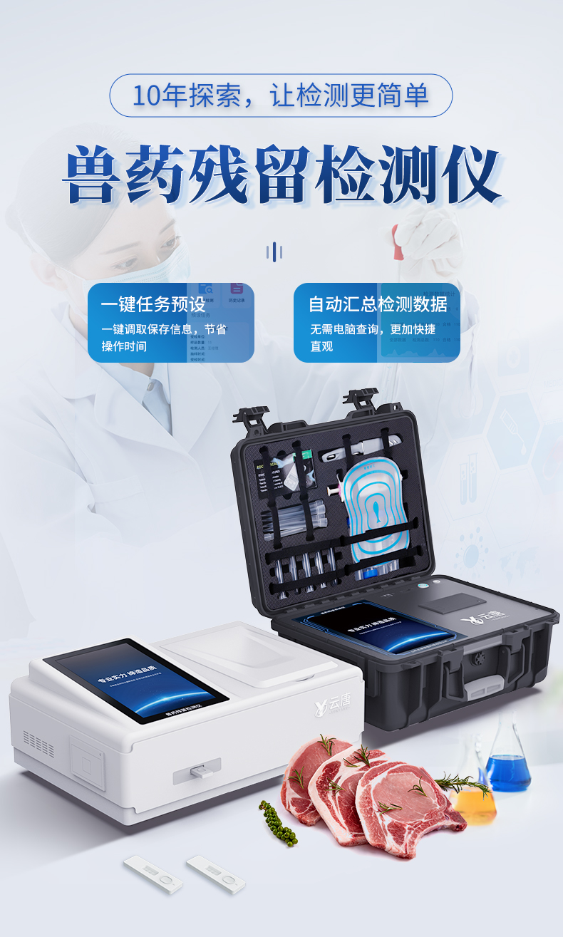 山東云唐智能科技有限公司生產(chǎn)的病害肉檢測(cè)儀為集成化食品安全快速檢測(cè)分析設(shè)備,采用臺(tái)式一體化設(shè)計(jì),可對(duì)豬肉、牛肉、羊肉、魚(yú)類(lèi)等存在的病害肉組胺、揮發(fā)性鹽基氮進(jìn)行快速定量檢測(cè),儀器預(yù)留其他項(xiàng)目檢測(cè)程序和端口,根據(jù)日后需求可進(jìn)行升級(jí)