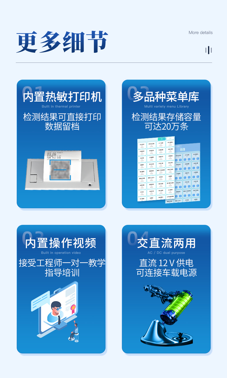 | 1、儀器采用臺(tái)式一體化系統(tǒng)檢測(cè)技術(shù),將分光光度模塊、數(shù)字化管理模塊、無(wú)線通訊模塊高度集成于一體,支持檢測(cè)幾十種食品安全檢測(cè)項(xiàng)目,同時(shí)預(yù)留升級(jí)檢測(cè)方法。 | 2、儀器檢測(cè)模塊標(biāo)準(zhǔn)化、智能化,檢測(cè)項(xiàng)目可隨意自由組合。檢測(cè)箱體內(nèi)置多個(gè)標(biāo)準(zhǔn)檢測(cè)單元,檢測(cè)模塊可以調(diào)整配置。 | 3、顯示屏幕:儀器采用7英寸液晶觸摸屏,搭配運(yùn)行安卓智能操作系統(tǒng),主控芯片采用ARM Cortex-A7,RK3288/4核處理器,主頻1.88Ghz,操作方便,性能更強(qiáng)。 | 4、檢測(cè)通道:≥12通道;采用精密旋轉(zhuǎn)比色池設(shè)計(jì),使用同芯片同光源校準(zhǔn)精度,解決不同光源之間的誤差值,更加準(zhǔn)確**。 | 5、儀器光源:高精度進(jìn)口四波長(zhǎng)冷光源,每個(gè)通道均配置 410、520、590、630nm 波長(zhǎng)光源,標(biāo)配**的光路切換裝置,專(zhuān)利光路切換功能可實(shí)現(xiàn)64波長(zhǎng),并且所有檢測(cè)項(xiàng)目可實(shí)現(xiàn)所有通道同時(shí)檢測(cè)。 | 6、通訊接口:配備無(wú)線通信模塊、可選配4G(APN)通訊模塊和藍(lán)牙傳輸,同時(shí)具有USB接口,可以多方式實(shí)現(xiàn)數(shù)據(jù)保存及數(shù)據(jù)傳輸。 | 7、存儲(chǔ)方式:支持U盤(pán)存儲(chǔ),標(biāo)準(zhǔn)USB接口,免驅(qū)動(dòng)安裝。檢測(cè)結(jié)果存儲(chǔ)容量20萬(wàn)條以上,可生成Excel表格進(jìn)行拷貝,并具有登錄保護(hù)功能。 | 8、智能化操作系統(tǒng) | 8.1、操作系統(tǒng):儀器可在同一檢測(cè)界面自動(dòng)對(duì)應(yīng)相關(guān)檢測(cè)通道,一次性選擇1-12個(gè)樣品名稱(chēng),無(wú)需退出界面,節(jié)省操作時(shí)間。并可以對(duì)每個(gè)通道屬性和樣品信息單獨(dú)進(jìn)行編輯,例如送檢單位、人員,檢測(cè)人員等,打印時(shí)勾選打印顯示。 | 8.2、限量規(guī)判系統(tǒng):具有限量查詢(xún)、添加物質(zhì)合規(guī)判定系統(tǒng)。檢測(cè)出結(jié)果后,系統(tǒng)自動(dòng)調(diào)用系統(tǒng)數(shù)據(jù)庫(kù)中相關(guān)國(guó)標(biāo)進(jìn)行比對(duì)判定,客觀顯示結(jié)果是否合格。 | 8.3、數(shù)據(jù)監(jiān)管系統(tǒng):同步對(duì)接監(jiān)管平臺(tái),數(shù)據(jù)可局域網(wǎng)和互聯(lián)網(wǎng)數(shù)據(jù)上傳,檢測(cè)結(jié)果可選擇直接傳至食品安全監(jiān)管平臺(tái)。進(jìn)行區(qū)域食品安全監(jiān)管及大數(shù)據(jù)分析處理與數(shù)據(jù)統(tǒng)計(jì),檢測(cè)區(qū)域食品安全長(zhǎng)短期動(dòng)態(tài),達(dá)到食品安全問(wèn)題預(yù)估、預(yù)警。 | 8.4、打印系統(tǒng):內(nèi)置全新打印機(jī),可以打印:項(xiàng)目名稱(chēng),二維碼,抽樣信息、檢測(cè)信息,受檢信息、復(fù)核信息、抽樣日期、檢測(cè)日期等信息的打印。 | 9、供電模式:儀器交直流兩用,直流12V供電(標(biāo)配),可連接車(chē)載電源,亦可選配6ah大容量充電鋰電池,電量可實(shí)時(shí)顯示,方便戶(hù)外流動(dòng)測(cè)試。 | 10、儀器具有重新校準(zhǔn)、鎖定、恢復(fù)出廠設(shè)置功能, | 11、外觀尺寸:415X310X150(mm) ,并可加配鋁合金手提箱 |
