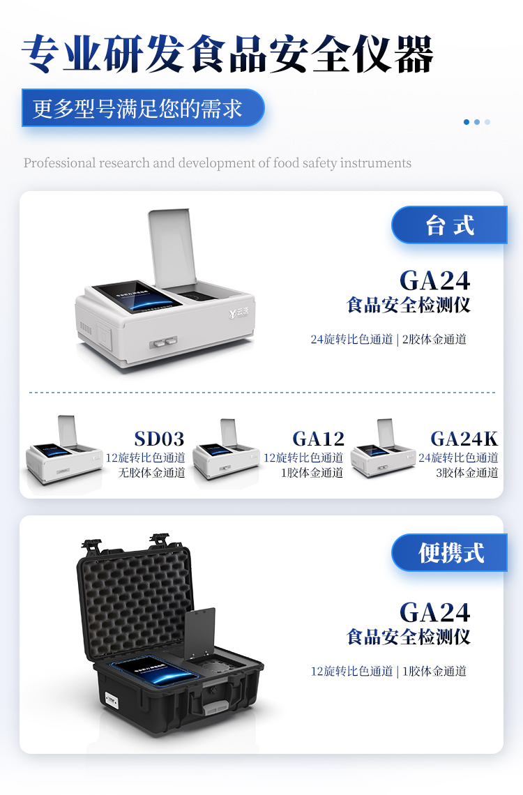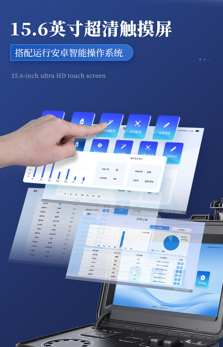 | 1. 功能構(gòu)成:主要包括分光光度模塊、新型農(nóng)殘檢測(cè)模塊、膠體金檢測(cè)模塊、熒光檢測(cè)模塊、數(shù)字化管理模塊等,所有模塊集成一體,可快速檢測(cè)200多種食品安全項(xiàng)目,如獸藥殘留、農(nóng)藥殘留、非法添加劑、細(xì)菌數(shù)值等指標(biāo)。 | 2. 檢測(cè)樣品種類:餐具及廚房用品、瓜果蔬菜及其制品、水產(chǎn)品及其制品、畜禽產(chǎn)品及其制品、嬰幼兒乳品及奶粉制品、蜂蜜、糧油及其制品、調(diào)味品(食醋、醬油、味精、鹽等)、酒類茶葉及其制品、食用菌、飲料、蛋類藥物殘留(雞蛋,鴨蛋等)、米豆面制品、糖果糕點(diǎn)類(小食品)、薯類及膨化食品、瓶(桶)裝飲用水、添加食用色素的食品、使用添加劑的食品、含有有毒有害物質(zhì)的相關(guān)食品。 | 3、顯示屏幕:儀器采用15.6英寸液晶觸摸屏顯,搭配運(yùn)行安卓智能操作系統(tǒng),主控芯片采用ARM Cortex-A7,RK3288/4核處理器,主頻1.88Ghz,操作方便,性能更強(qiáng)。 | 4、供電模式:儀器交直流兩用,直流12V供電,可連接車載電源,配18ah大容量充電鋰電池,電量可實(shí)時(shí)顯示,無(wú)外部電源條件下可持續(xù)工作至少 4 小時(shí)。 | 5、檢測(cè)通道:≥24通道;采用精密旋轉(zhuǎn)比色池設(shè)計(jì),使用同芯片同光源校準(zhǔn)精度,解決不同光源之間的誤差值,更加準(zhǔn)確**,采用高精度進(jìn)口四波長(zhǎng)冷光源,每個(gè)通道均配置 410、520、590、630nm 波長(zhǎng)光源,標(biāo)配**的光路切換裝置,專利光路切換功能可實(shí)現(xiàn)64波長(zhǎng),并且所有檢測(cè)項(xiàng)目可實(shí)現(xiàn)所有通道同時(shí)檢測(cè). | 6、通訊接口:配備無(wú)線通信模塊、4G(APN)通訊模塊、藍(lán)牙傳輸,同時(shí)具有雙USB接口以及RJ45網(wǎng)線接口,可以多方式實(shí)現(xiàn)數(shù)據(jù)保存及數(shù)據(jù)傳輸。 | 7、存儲(chǔ)方式:支持U盤存儲(chǔ),兩個(gè)標(biāo)準(zhǔn)USB接口,免驅(qū)動(dòng)安裝。檢測(cè)結(jié)果存儲(chǔ)容量20萬(wàn)條以上,可生成Excel表格進(jìn)行拷貝,并具有登錄保護(hù)功能。 | 8、操作系統(tǒng):儀器可在同一檢測(cè)界面自動(dòng)對(duì)應(yīng)相關(guān)檢測(cè)通道,一次性選擇不少于11個(gè)樣品名稱,無(wú)需退出界面,節(jié)省操作時(shí)間。并可以對(duì)每個(gè)通道屬性和樣品信息單獨(dú)進(jìn)行編輯,例如送檢單位、人員,檢測(cè)人員等,打印時(shí)勾選打印顯示。 | 9、數(shù)據(jù)集成系統(tǒng):設(shè)備首頁(yè)自動(dòng)匯總分析檢測(cè)數(shù)據(jù),包含:周檢測(cè)數(shù)據(jù)、月檢測(cè)數(shù)據(jù),全部檢測(cè)總數(shù)量,包含檢測(cè)總數(shù),合格數(shù),不合格數(shù),以及相關(guān)柱形分析圖,各項(xiàng)檢測(cè)數(shù)據(jù)一目了然,無(wú)需電腦查詢,更加快捷直觀。 | 10、數(shù)據(jù)庫(kù)系統(tǒng):十幾項(xiàng)數(shù)據(jù)庫(kù)分類管理儀器:包含項(xiàng)目類型、項(xiàng)目數(shù)據(jù)、檢測(cè)數(shù)據(jù)、歷史記錄、國(guó)標(biāo)信息、曲線信息、采樣信息、檢測(cè)信息、受檢信息、復(fù)核信息、圖表信息、光源校準(zhǔn)信息、打印樣式信息、樣品庫(kù)信息等等,數(shù)據(jù)庫(kù)之間互相協(xié)調(diào)聯(lián)動(dòng)保證數(shù)據(jù)的真實(shí)完整性。同時(shí)產(chǎn)品數(shù)據(jù)庫(kù)以及歷史檢測(cè)記錄支持一鍵檢索功能。 | 11、限量規(guī)判系統(tǒng):具有限量查詢、添加物質(zhì)合規(guī)判定系統(tǒng)。檢測(cè)出結(jié)果后,系統(tǒng)自動(dòng)調(diào)用系統(tǒng)數(shù)據(jù)庫(kù)中相關(guān)國(guó)標(biāo)進(jìn)行比對(duì)判定,客觀顯示判定結(jié)果是否合格。 | 12、項(xiàng)目預(yù)設(shè)系統(tǒng):儀器具有任務(wù)預(yù)設(shè)模塊,一鍵提前預(yù)設(shè),給出方便快捷的新檢測(cè)方案,每一個(gè)任務(wù)分別可以設(shè)置不同的樣品、批次、編號(hào)、來(lái)源、備注、抽樣信息、檢測(cè)信息、受檢信息、復(fù)核信息等更多信息。樣品送檢時(shí)一鍵調(diào)取保存信息,并可多次調(diào)取,適用于大批量檢測(cè)業(yè)務(wù),可以大大提高檢測(cè)效率。 | 13、數(shù)據(jù)監(jiān)管系統(tǒng):同步對(duì)接監(jiān)管平臺(tái),數(shù)據(jù)可局域網(wǎng)和互聯(lián)網(wǎng)數(shù)據(jù)上傳,檢測(cè)結(jié)果可直接傳至食品安全監(jiān)管平臺(tái)。進(jìn)行區(qū)域食品安全監(jiān)管及大數(shù)據(jù)分析處理與數(shù)據(jù)統(tǒng)計(jì),監(jiān)測(cè)區(qū)域食品安全長(zhǎng)短期動(dòng)態(tài)及問(wèn)題預(yù)估、預(yù)警。 | 14.1、全新打印系統(tǒng):內(nèi)置全新打印機(jī),新創(chuàng)自定義打印方式,可按需靈活勾選控制:產(chǎn)品合格證(國(guó)家農(nóng)業(yè)部標(biāo)準(zhǔn)要求),二維碼,抽樣信息、檢測(cè)信息,受檢信息、復(fù)核信息、抽樣日期、檢測(cè)日期等信息的打印。 | 14.2、A4紙版本報(bào)告打印功能:設(shè)備擁有兩種結(jié)果展示方式,可以自動(dòng)生成A4打印模板和小票打印模板兩種樣式,可通過(guò)WiFi及網(wǎng)線等方式連接外置打印機(jī)可進(jìn)行打印。 | 15、膠體金檢測(cè)模塊:采用單通道CMOS成像處理技術(shù)及膠體金免疫層析技術(shù),可讀取膠體金卡數(shù)據(jù),自動(dòng)采集