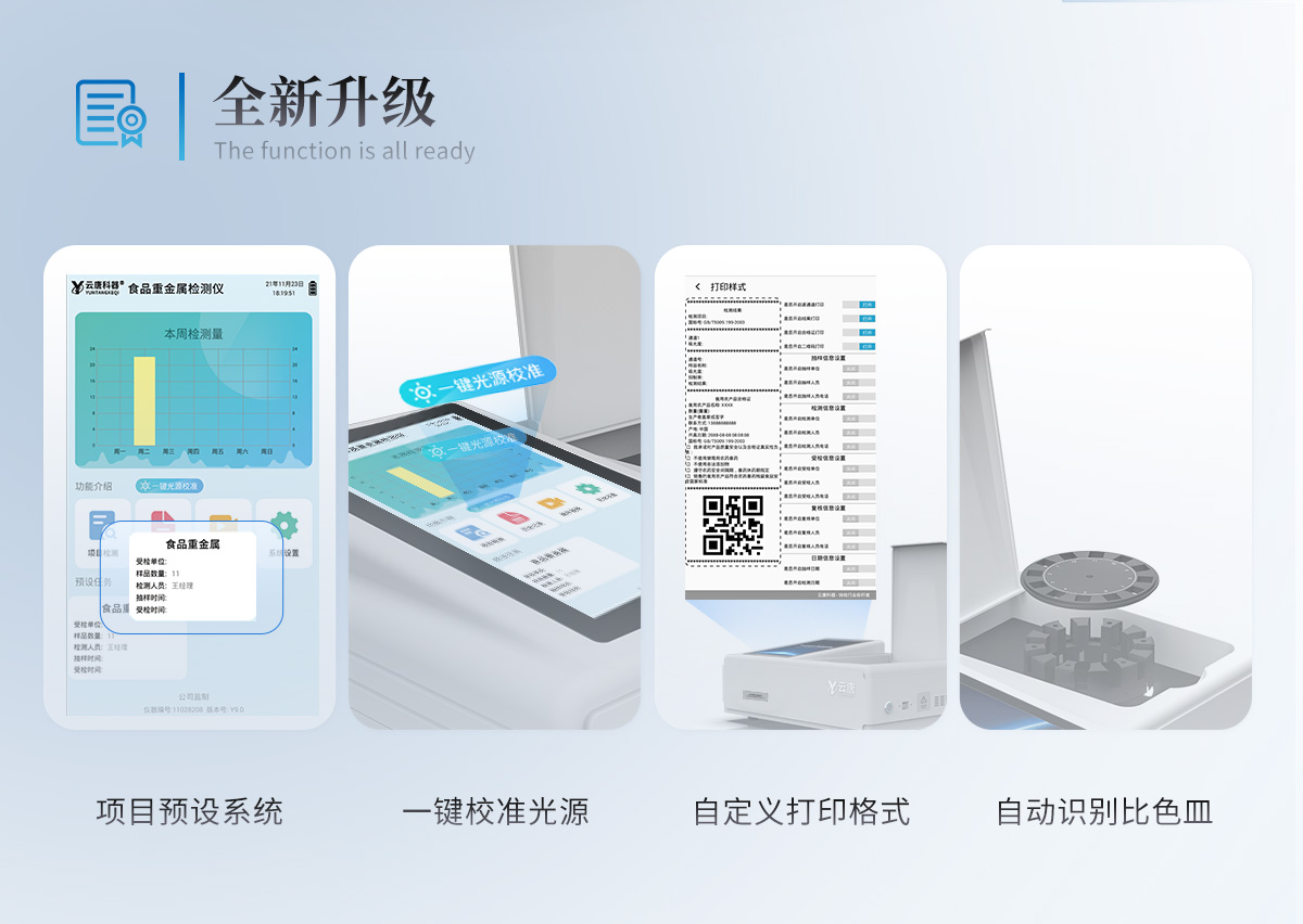 | 儀器采用臺(tái)式一體化系統(tǒng)檢測(cè)技術(shù),將分光光度模塊、新型農(nóng)殘檢測(cè)模塊、數(shù)字化管理模塊、無(wú)線通訊模塊高度集成于一體,支持檢測(cè)200種食品安全檢測(cè)項(xiàng)目,同時(shí)預(yù)留升級(jí)檢測(cè)方法。 | 儀器檢測(cè)模塊標(biāo)準(zhǔn)化、智能化,可隨意自由組合。檢測(cè)箱體內(nèi)置多個(gè)標(biāo)準(zhǔn)檢測(cè)單元,檢測(cè)模塊可以調(diào)整配置。 | 儀器采用全新安卓智能系統(tǒng),主控芯片采用 ARM Cortex-A7,RK3288/4核處理器,10.1寸高清液晶觸摸豎屏,更加**的UI交互界面,運(yùn)轉(zhuǎn)快捷;儀器配備無(wú)線通信模塊: 4G(APN)通訊模塊、Wifi模塊,藍(lán)牙傳輸,同時(shí)具有雙USB接口以及RJ45接口能以多種方式實(shí)現(xiàn)數(shù)據(jù)保存和數(shù)據(jù)傳輸功能。 | 創(chuàng)新檢測(cè)模式: | ★檢測(cè)通道:≥12通道;采用精密旋轉(zhuǎn)比色池設(shè)計(jì),使用同芯片同光源校準(zhǔn)精度,解決不同光源之間的誤差值。1-12通道間誤差0.1%。(***:**202022821055.2) | ★儀器具有自動(dòng)識(shí)別比色皿檢測(cè)功能,即:將樣品比色皿放入儀器后,點(diǎn)擊樣品檢測(cè),儀器自動(dòng)識(shí)別比色皿進(jìn)行通道檢測(cè)。 | 進(jìn)口高精光源: | 高精度進(jìn)口四波長(zhǎng)冷光源,通道配置 410、520、590、630nm 波長(zhǎng)光源,一個(gè)光源芯片驅(qū)動(dòng)一個(gè)光源,誤差極小,每臺(tái)設(shè)備單獨(dú)**校準(zhǔn)光源,**比對(duì),同時(shí)參照四種不同波段光源全方位覆蓋市面上99%的農(nóng)殘食品項(xiàng)目檢測(cè)。 | 智能化操作系統(tǒng): | 便捷操作系統(tǒng):設(shè)備檢測(cè)時(shí)可在同一檢測(cè)界面自動(dòng)對(duì)應(yīng)相關(guān)檢測(cè)通道一次性選擇1-12個(gè)樣品名稱,無(wú)須退出界面,節(jié)省操作時(shí)間。 | 數(shù)據(jù)集成系統(tǒng):設(shè)備首頁(yè)自動(dòng)統(tǒng)計(jì)檢測(cè)數(shù)據(jù)包含:周檢測(cè)數(shù)據(jù)、月檢測(cè)數(shù)據(jù),全部檢測(cè)總數(shù)量,均包含檢測(cè)總數(shù),合格數(shù),不合格數(shù),以及相關(guān)柱形分析圖,對(duì)各項(xiàng)檢測(cè)數(shù)據(jù)清晰掌握,無(wú)需電腦查詢,更加快捷直觀。 | 項(xiàng)目預(yù)設(shè)系統(tǒng):支持添加單個(gè)及多個(gè)相同或不相同的任務(wù)預(yù)設(shè),一鍵快速調(diào)取,每一個(gè)任務(wù)分別可以設(shè)置不同的樣品、批次、編號(hào)、來(lái)源、備注、抽樣信息、檢測(cè)信息、受檢信息、復(fù)核信息等更多信息。無(wú)縫鏈接平臺(tái)和APP實(shí)時(shí)查看下發(fā)任務(wù)。 | 數(shù)據(jù)監(jiān)管系統(tǒng):同步對(duì)接監(jiān)管平臺(tái),數(shù)據(jù)可局域網(wǎng)和互聯(lián)網(wǎng)數(shù)據(jù)上傳,檢測(cè)結(jié)果可選擇直接傳至食品安全監(jiān)管平臺(tái)。集成OSS輸出存儲(chǔ)服務(wù)、區(qū)分設(shè)備定向管理應(yīng)用,進(jìn)行區(qū)域食品安全監(jiān)管及大數(shù)據(jù)分析處理與數(shù)據(jù)統(tǒng)計(jì),檢測(cè)區(qū)域食品安全長(zhǎng)短期動(dòng)態(tài),達(dá)到食品安全問(wèn)題預(yù)估、預(yù)警。 | 自定義打印系統(tǒng):內(nèi)置全新打印系統(tǒng),新創(chuàng)自定義打印方式,可按需靈活設(shè)置開(kāi)啟或關(guān)閉:產(chǎn)品合格證(國(guó)家農(nóng)業(yè)部標(biāo)準(zhǔn)要求),二維碼,抽樣信息、檢測(cè)信息,受檢信息、復(fù)核信息、抽樣日期、檢測(cè)日期等信息的打印。 | 系統(tǒng)遠(yuǎn)程更新功能:可定向分客戶分儀器更新系統(tǒng),按照不同客戶后期實(shí)際需求添加項(xiàng)目,無(wú)需機(jī)器返廠,即可遠(yuǎn)程實(shí)時(shí)升級(jí)全新系統(tǒng),節(jié)省時(shí)間成本及避免運(yùn)輸造成設(shè)備損壞。 | 儀器主機(jī)采用一體化防水、抗壓、防撞擊、防腐蝕箱體設(shè)計(jì),同時(shí)配備交直流供電,可連接車載電源,可選配大容量充電鋰電池,滿足現(xiàn)場(chǎng)野外檢測(cè)需求。 | 安全證書(shū),放心保障:儀器具有中國(guó)計(jì)量科學(xué)研究院校準(zhǔn)證書(shū),權(quán)威認(rèn)證。 |