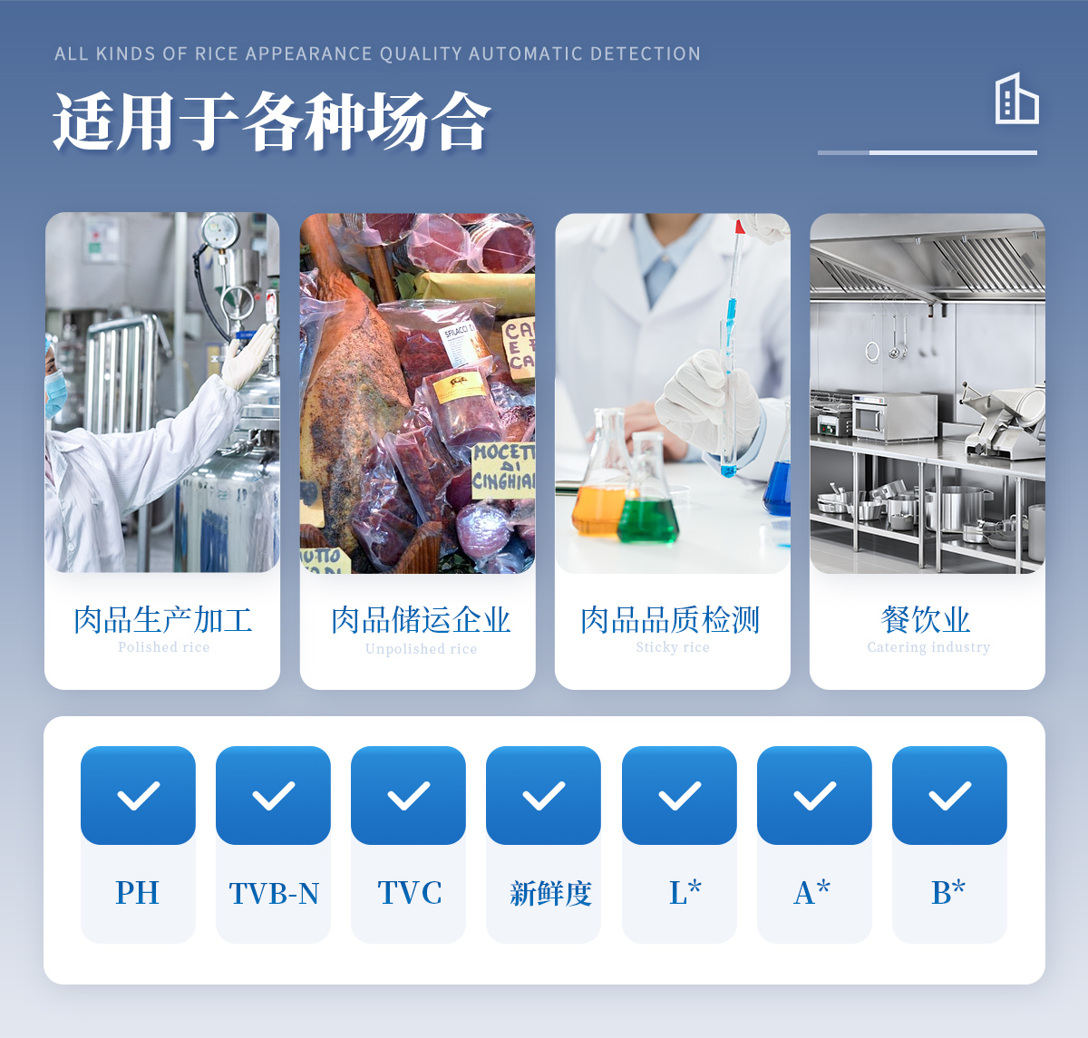 聯(lián)合中國農(nóng)業(yè)大學(xué)彭彥昆教授團(tuán)隊研發(fā)的掌上式生鮮肉新鮮度分析儀,可用于檢測生鮮肉的TVC、pH、TVB-N、新鮮度、L*、A*、B*等評價指標(biāo)。Palmarter具有體積小、便 于攜帶、性價比高等特點,其應(yīng)用場景包括但不限于肉儲運(yùn)企業(yè)、肉品品質(zhì)監(jiān)管部門、飯店、超市、菜場、家庭等。