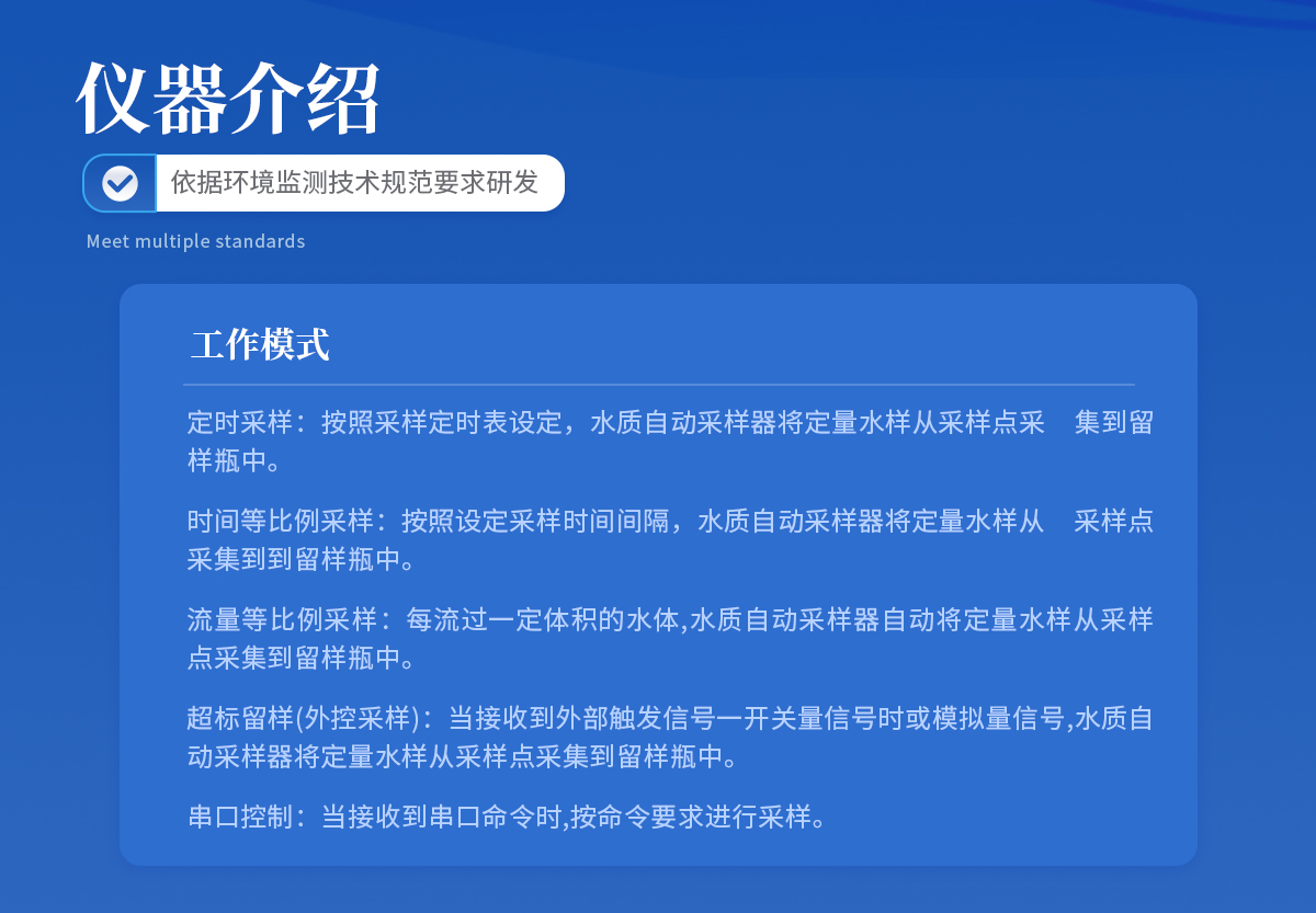 | 1.定時采樣:按照采樣定時表設定,水質自動采樣器將定量水樣從采樣點采 集到留樣瓶中。 | 2.時間等比例采樣:按照設定采樣時間間隔,水質自動采樣器將定量水樣從 采樣點采集到到留樣瓶中。 | 3.流量等比例采樣:每流過一定體積的水體,水質自動采樣器自動將定量水樣從采樣點采集到留樣瓶中。 | 4.超標留樣(外控采樣):當接收到外部觸發(fā)信號一開關量信號時或模擬量信號,水質自動采樣器將定量水樣從采樣點采集到留樣瓶中。 | 5.串口控制:當接收到串口命令時,按命令要求進行采樣。 |