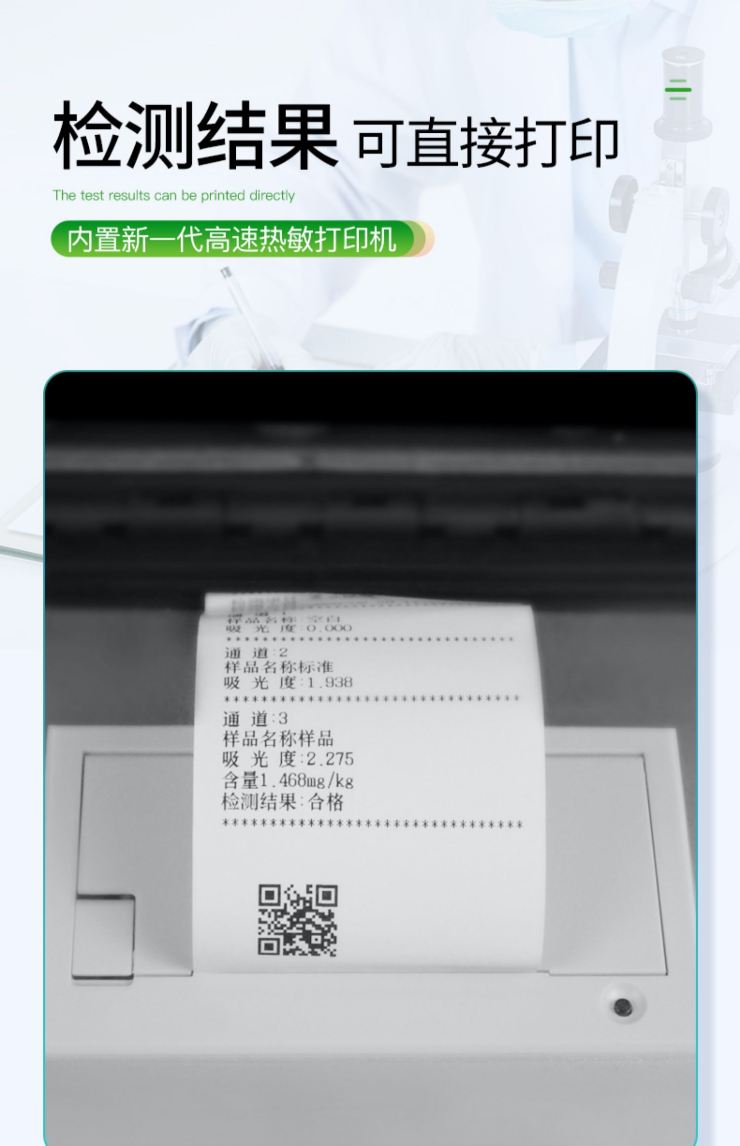 18、內(nèi)置新一代高速熱敏打印機(無需色帶),打印內(nèi)容包含:檢測單位、檢測人員、檢測項目、通道號、吸光度、養(yǎng)分含量(mg/kg)、檢測時間、以及二維碼等信息