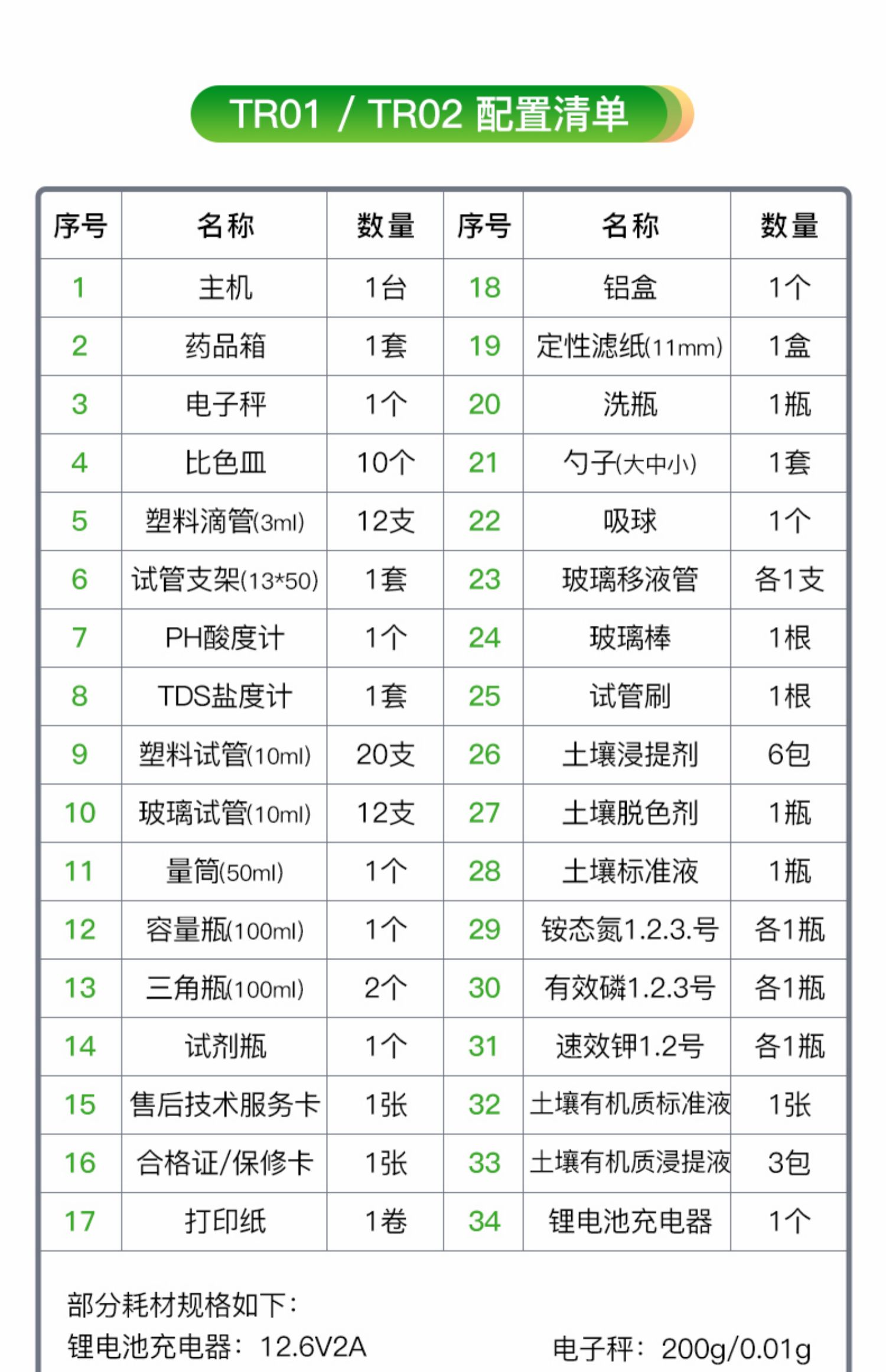 | 2 | PH計 | 1支 | 2 | 氮磷鉀有機質(zhì)試劑 | 1套 |
