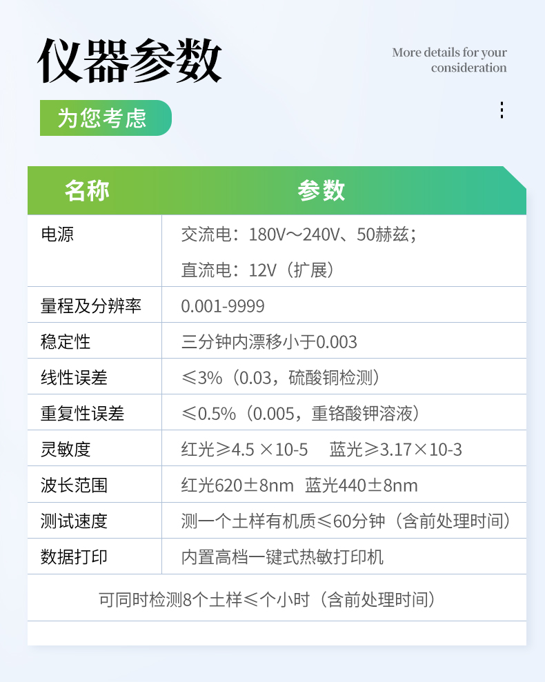 測(cè)一個(gè)土壤樣品(N、P、K)≤30分鐘,同時(shí)檢測(cè)三個(gè)土壤樣品(N、P、K)≤40分鐘;