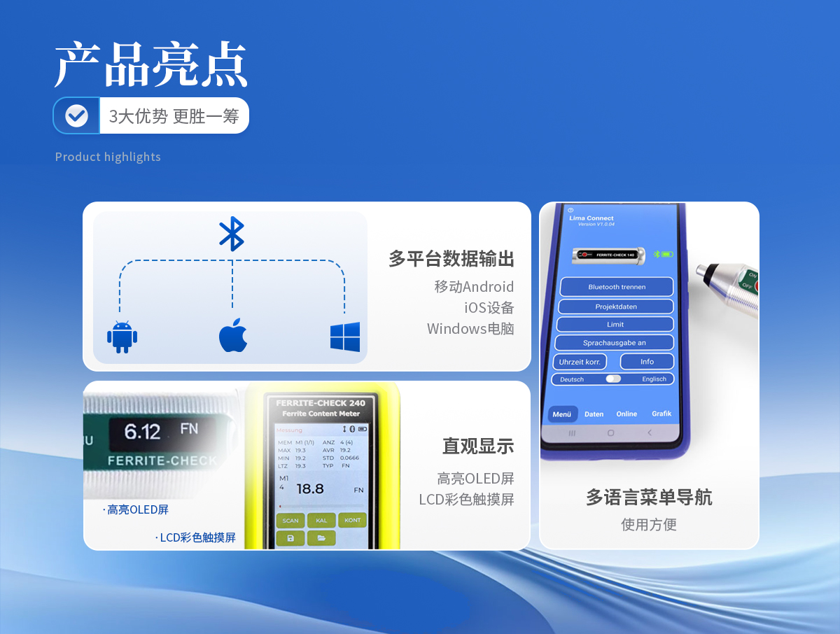 FERRITE-CHECK 240鐵素體含量檢測儀采用分體式的設(shè)計(jì),使用方便,儀器符合Basel標(biāo)準(zhǔn)DIN EN ISO 8249,使用磁感應(yīng)法測量奧氏體鋼和雙相鋼中的鐵素體含量。 全新測頭