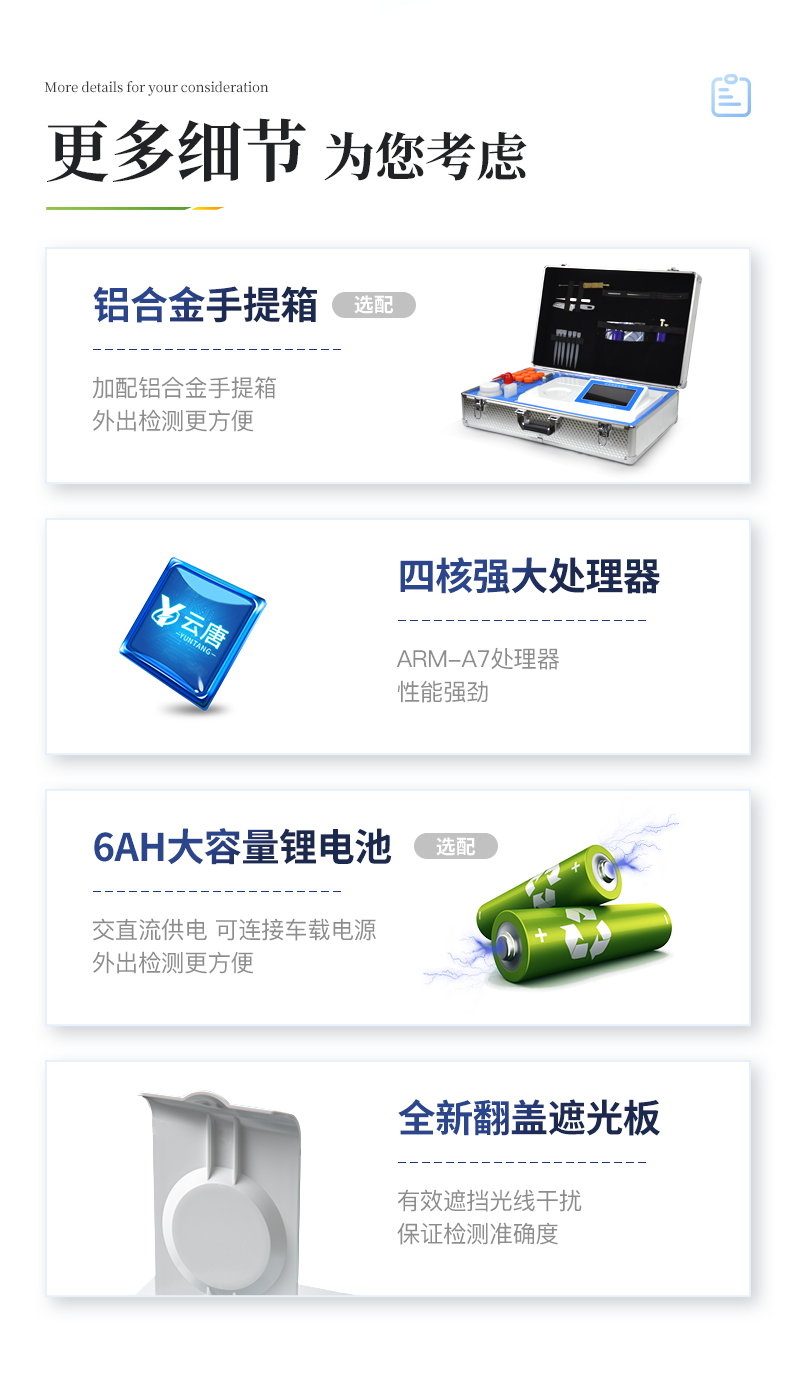 2、儀器檢測模塊標(biāo)準(zhǔn)化、智能化,檢測項(xiàng)目可隨意自由組合。檢測箱體內(nèi)置多個標(biāo)準(zhǔn)檢測單元,檢測模塊可以調(diào)整配置。