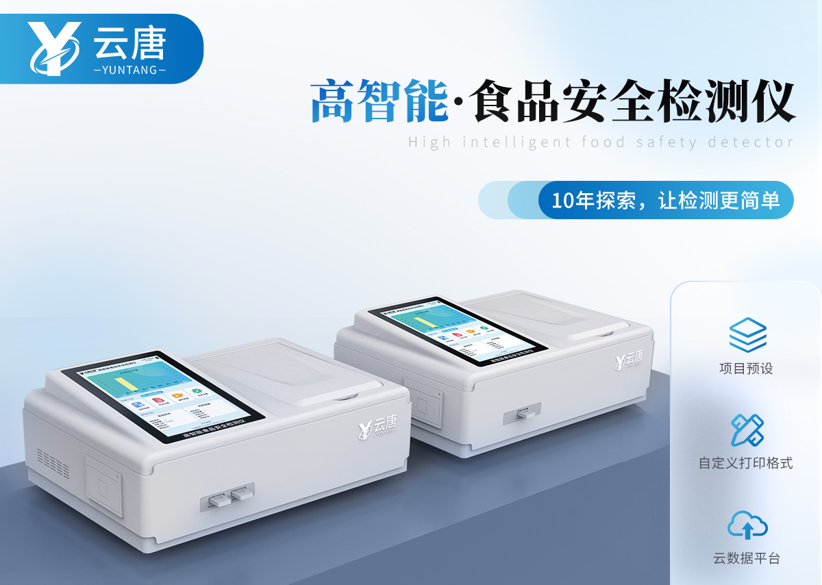 山東云唐智能科技有限公司生產(chǎn)的高智能食品安全檢測儀為集成化食品安全快速檢測分析設(shè)備,采用臺式一體化設(shè)計,可快速檢測200多種食品安全項目,包含非食用化學(xué)物質(zhì)、濫用食品添加劑、農(nóng)藥殘留、獸藥殘留、重金屬、病害肉、營養(yǎng)強化劑、抗生素類殘留、激素類殘留、真菌毒素類殘留、化學(xué)類殘留等項目的定性定量檢測。目前廣泛應(yīng)用于市場監(jiān)管局、檢測中心、衛(wèi)生監(jiān)督部門、農(nóng)業(yè)部門、院校及各單位食堂、食品肉產(chǎn)品深加工企業(yè)、商超市場、司法部門、餐飲機構(gòu)、養(yǎng)殖場、屠宰場、檢驗檢疫部門等單位。