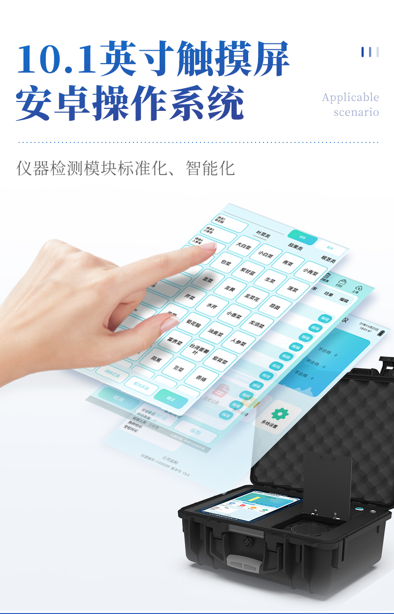 | 1、儀器采用臺(tái)式一體化系統(tǒng)檢測(cè)技術(shù),將分光光度模塊、膠體金檢測(cè)模塊、新型農(nóng)殘檢測(cè)模塊、數(shù)字化管理模塊、無(wú)線通訊模塊高度集成于一體,支持檢測(cè)200種食品安全檢測(cè)項(xiàng)目,同時(shí)預(yù)留升級(jí)檢測(cè)方法。 | 2、儀器檢測(cè)模塊標(biāo)準(zhǔn)化、智能化,檢測(cè)項(xiàng)目可隨意自由組合。檢測(cè)箱體內(nèi)置多個(gè)標(biāo)準(zhǔn)檢測(cè)單元,檢測(cè)模塊可以調(diào)整配置。 | 3、顯示屏幕:儀器采用10.1英寸豎向液晶觸摸屏顯,搭配運(yùn)行安卓智能操作系統(tǒng),主控芯片采用ARM Cortex-A7,RK3288/4核處理器,主頻1.88Ghz,操作方便,性能更強(qiáng)。 | 4、檢測(cè)通道:≥12通道;采用精密旋轉(zhuǎn)比色池設(shè)計(jì),使用同芯片同光源校準(zhǔn)精度,解決不同光源之間的誤差值,更加準(zhǔn)確**。(1-12通道間誤差0.1%,***:**202022821055.2) | 5、儀器光源:高精度進(jìn)口四波長(zhǎng)冷光源,每個(gè)通道均配置 410、520、590、630nm 波長(zhǎng)光源,標(biāo)配**的光路切換裝置,專利光路切換功能可實(shí)現(xiàn)64波長(zhǎng),并且所有檢測(cè)項(xiàng)目可實(shí)現(xiàn)所有通道同時(shí)檢測(cè)。 | 6、設(shè)備可一鍵校準(zhǔn),自動(dòng)保存校準(zhǔn)數(shù)據(jù),自動(dòng)對(duì)比校驗(yàn),得到精準(zhǔn)光源,采用Android SP存儲(chǔ)數(shù)據(jù),光源數(shù)據(jù)永不丟失,方便每一次使用。 | 7、通訊接口:配備無(wú)線通信模塊、4G(APN)通訊模塊、藍(lán)牙傳輸,同時(shí)具有雙USB接口以及RJ45網(wǎng)線接口,可以多方式實(shí)現(xiàn)數(shù)據(jù)保存及數(shù)據(jù)傳輸。 | 8、存儲(chǔ)方式:支持U盤存儲(chǔ),標(biāo)準(zhǔn)USB接口,免驅(qū)動(dòng)安裝。檢測(cè)結(jié)果存儲(chǔ)容量20萬(wàn)條以上,可生成Excel表格進(jìn)行拷貝,并具有登錄保護(hù)功能。 | 9、智能化操作系統(tǒng): | 9.1、操作系統(tǒng):儀器可在同一檢測(cè)界面自動(dòng)對(duì)應(yīng)相關(guān)檢測(cè)通道,一次性選擇1-12個(gè)樣品名稱,無(wú)需退出界面,節(jié)省操作時(shí)間。并可以對(duì)每個(gè)通道屬性和樣品信息單獨(dú)進(jìn)行編輯,例如送檢單位、人員,檢測(cè)人員等,打印時(shí)勾選打印顯示。 | 9.2、數(shù)據(jù)集成系統(tǒng):設(shè)備首頁(yè)自動(dòng)匯總分析檢測(cè)數(shù)據(jù),包含:周檢測(cè)數(shù)據(jù)、月檢測(cè)數(shù)據(jù),全部檢測(cè)總數(shù)量,均包含檢測(cè)總數(shù),合格數(shù),不合格數(shù),以及相關(guān)柱形分析圖,各項(xiàng)檢測(cè)數(shù)據(jù)一目了然,無(wú)需電腦查詢,更加快捷直觀。 | 9.3、數(shù)據(jù)庫(kù)系統(tǒng):十幾項(xiàng)數(shù)據(jù)庫(kù)分類管理儀器:包含項(xiàng)目類型、項(xiàng)目數(shù)據(jù)、檢測(cè)數(shù)據(jù)、歷史記錄、國(guó)標(biāo)信息、曲線信息、采樣信息、檢測(cè)信息、受檢信息、復(fù)核信息、圖表信息、光源校準(zhǔn)信息、打印樣式信息、樣品庫(kù)信息等等,數(shù)據(jù)庫(kù)之間互相協(xié)調(diào)聯(lián)動(dòng)保證數(shù)據(jù)的真實(shí)完整性。同時(shí)產(chǎn)品數(shù)據(jù)庫(kù)以及歷史檢測(cè)記錄支持一鍵檢索功能。 | 9.4、限量規(guī)判系統(tǒng):具有限量查詢、添加物質(zhì)合規(guī)判定系統(tǒng)。檢測(cè)出結(jié)果后,系統(tǒng)自動(dòng)調(diào)用系統(tǒng)數(shù)據(jù)庫(kù)中相關(guān)國(guó)標(biāo)進(jìn)行比對(duì)判定,客觀顯示判定結(jié)果是否合格。 | 9.5、項(xiàng)目預(yù)設(shè)系統(tǒng):儀器具有任務(wù)預(yù)設(shè)模塊,一鍵提前預(yù)設(shè),給出方便快捷的新檢測(cè)方案,每一個(gè)任務(wù)分別可以設(shè)置不同的樣品、批次、編號(hào)、來(lái)源、備注、抽樣信息、檢測(cè)信息、受檢信息、復(fù)核信息等更多信息。樣品送檢時(shí)一鍵調(diào)取保存信息,并可多次調(diào)取,大大提高檢測(cè)效率。 | 9.6、數(shù)據(jù)監(jiān)管系統(tǒng):同步對(duì)接監(jiān)管平臺(tái),數(shù)據(jù)可局域網(wǎng)和互聯(lián)網(wǎng)數(shù)據(jù)上傳,檢測(cè)結(jié)果可選擇直接傳至食品安全監(jiān)管平臺(tái)。進(jìn)行區(qū)域食品安全監(jiān)管及大數(shù)據(jù)分析處理與數(shù)據(jù)統(tǒng)計(jì),檢測(cè)區(qū)域食品安全長(zhǎng)短期動(dòng)態(tài),達(dá)到食品安全問(wèn)題預(yù)估、預(yù)警。 | 9.7.1、全新打印系統(tǒng):內(nèi)置全新打印機(jī),新創(chuàng)自定義打印方式,可按需靈活勾選控制:產(chǎn)品合格證(國(guó)家農(nóng)業(yè)部標(biāo)準(zhǔn)要求),二維碼,抽樣信息、檢測(cè)信息,受檢信息、復(fù)核信息、抽樣日期、檢測(cè)日期等信息的打印。 | 9.7.2、A4紙版本報(bào)告打印功能(選配):設(shè)備擁有兩種結(jié)果展示方式,可以自動(dòng)生成A4打印模板和小票打印模板兩種樣式,可通過(guò)WiFi及網(wǎng)線等方式鏈接外置打印機(jī)可進(jìn)行打印。 | 10、供電模式:儀器交直流兩用,直流12V供電,可連接車載電源,可配6ah大容量充電鋰電池,電量可實(shí)時(shí)顯示,方便戶外流動(dòng)測(cè)試。 | 11、膠體金檢測(cè)模塊:采用單通道CMOS成像處理技術(shù)及膠體金免疫層析技術(shù),可讀取膠體金卡數(shù)據(jù),自動(dòng)采集、處理分析,將檢